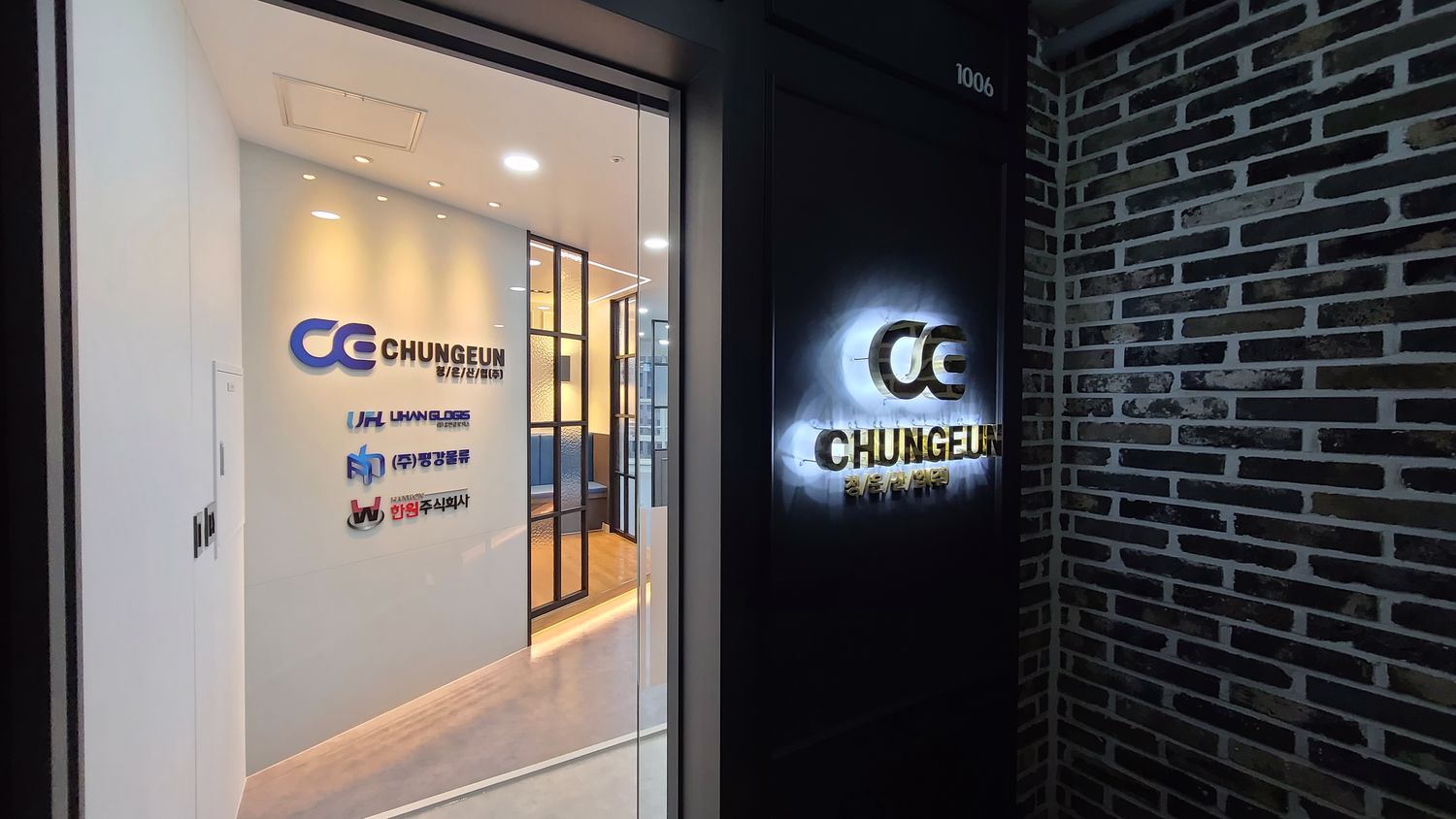 트렌디하고 모던하게 완성된 위례 사무실 인테리어 같이 살펴보실게요. 우선 입구의 모습입니다. 메인 출입구는 강화유리 자동도어로 설계하였으며 도장 컬러와 오른쪽의 파벽을 동일한 그레이톤으로 일치시켰습니다. 그리고 로고를 돌출 골드 스카시를 사용하면서 LED 조명을 함께 설치하여 한눈에 사무실의 정체성을 알 수 있도록 연출하였습니다.