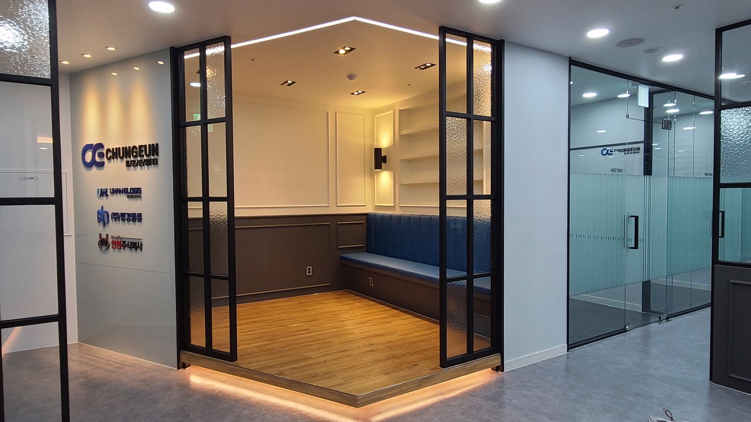 CEO실의 도어 및 외관도 유리로 시공하여 공간이 분리된 프라이빗함은 느껴지지만, 바깥에서 내부가 보이며 개방감을 높여주었습니다. 그리고 전체 프레임은 외관의 도장 컬러와 일치시켜서 계속해서 통일감을 주었어요.