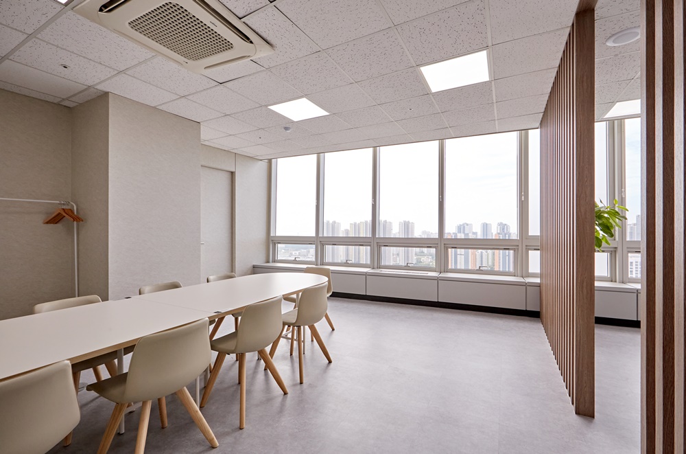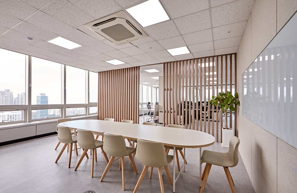 화이트톤 벽면과 우드 질감이 조화를 이루어 업무 회의 중에도 심리적으로 안정되고 집중하기 좋은 환경을 완성했어요.