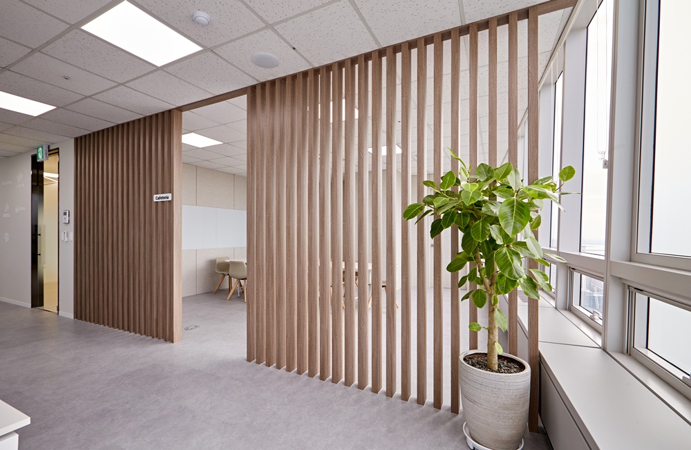 미팅룸 구역에는 목재 세로격자 파티션을 설치해 개방감은 유지하면서도 자연스러운 구획이 이루어지도록 했죠.