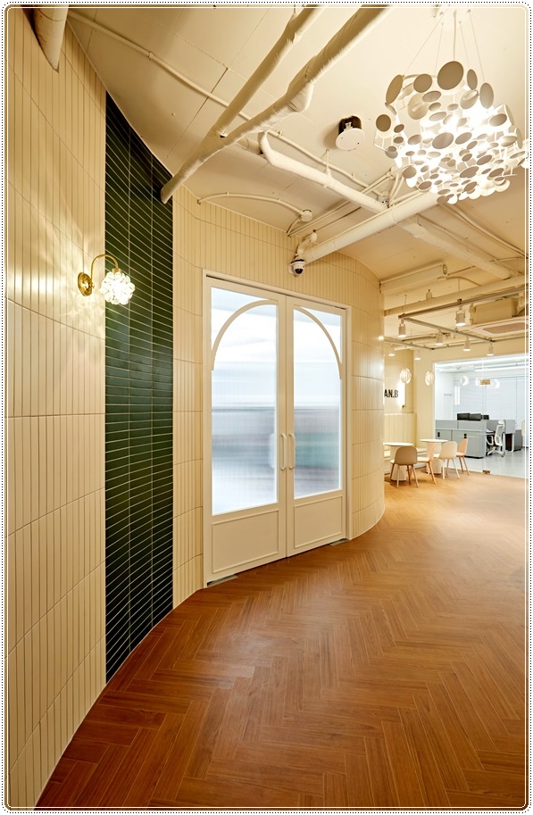 내부는 로비 공간과 사무공간으로 영역이 나뉘고 로비 공간에는 대표실이 함께 배치돼있어 방문객을 응대하기 쉽게 해드렸습니다. 로비는 노출천장으로 높은 층고를 확보했고 베이지톤 벽면과 헤링본 패턴의 우드 바닥으로 시공해 고급스럽게 연출습니다. 여기에 디자인 조명, 벽무 조명, 레일형 조명 등을 구성하고 따뜻한 색감의 전구를 적용해 풍부한 연출과 함께 아늑한 느낌이 들게 했습니다.
