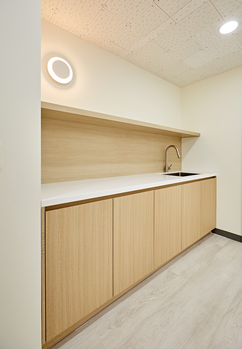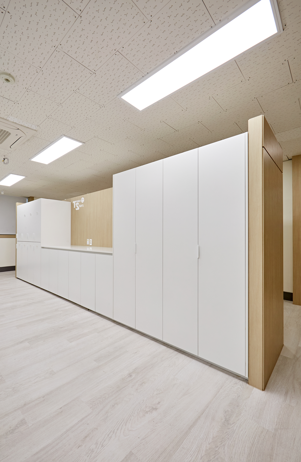 천장은 화이트 시스템 천장과 매입형 LED 조명으로 마감해 공간 전체가 밝고 쾌적한 환경을 제공합니다.