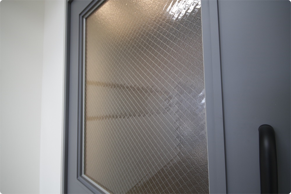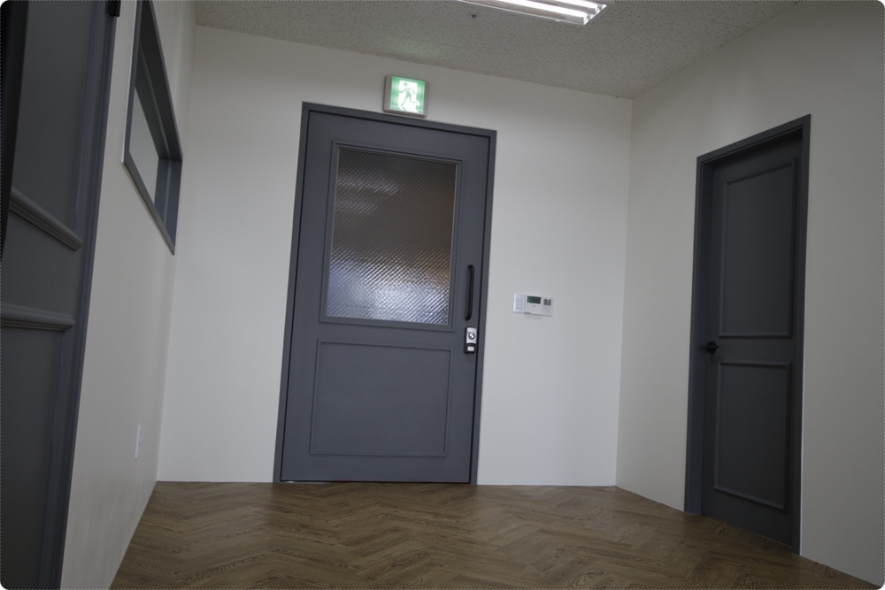 회사의 입구는 컬러와 웨인스코팅을 적용했지만 상부 웨인스코팅을 뚫어 반투명 망입유리를 시공했는데요, 반투명 망입유리는 외부로부터 시선을 차단해 프라이버시를 보호할 수 있고 안에 철사가 구성돼 있어 지진, 해일 등의 자연재해에도 안전하고 화재, 파손 등의 위험한 상황이 발생하더라도 연소를 방지하는 효과가 있으며 파편이 크게 흩어지지 않는 장점이 있어 안전하게 사용할 수 있습니다.