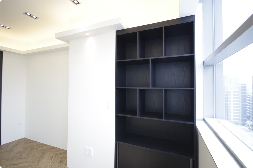 각 공간의 가구는 공간별로 디자인을 적용했는데요, 회의실에는 빌트인 수납 책장을 배치하고 공용공간인 탕비실에는 청결하고 위생적인 화이트 상부장과 하부장을 설치해 역할과 기능에 충실하도록 인테리어했습니다.