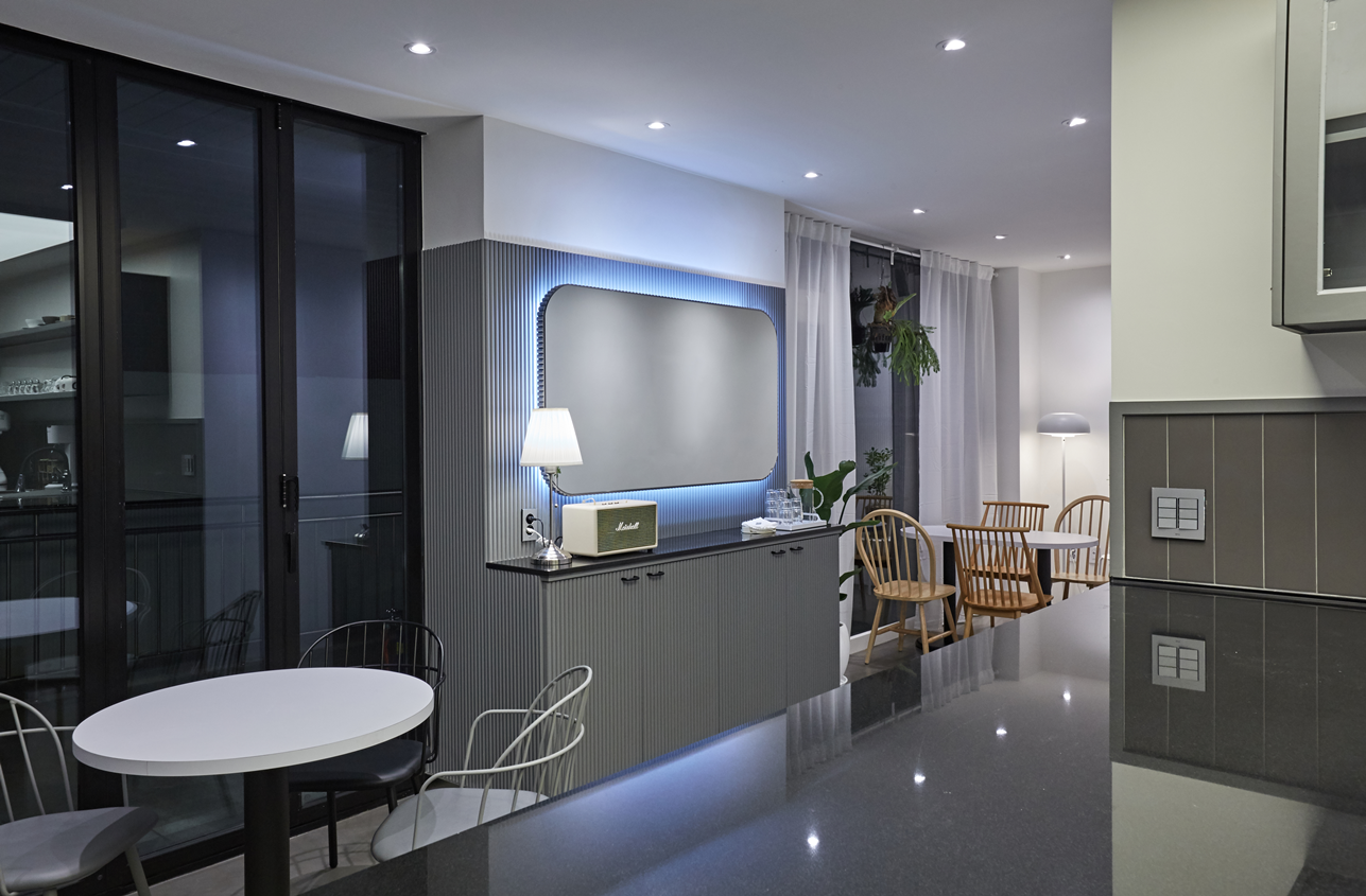전체적으로 군더더기 없이 정돈된 공간이지만, 조명과 그레이톤 벽체 포인트,