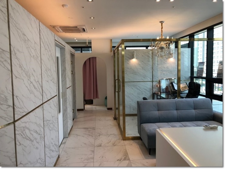 매장 로비에서 안쪽으로 들어오면 상담을 할 수 있는 공간이 마련되어 있습니다. 답답해 보이는 느낌이 없도록 통유리로 설계해 드렸으며 골드 프레임 디자인을 더하여 고급스러운 소형 뷰티샵인테리어 디자인으로 완성되었습니다. 거기에 샹들리에 조명을 더해주어 완성도가 높아진 공간으로 만나 보실 수 있습니다.