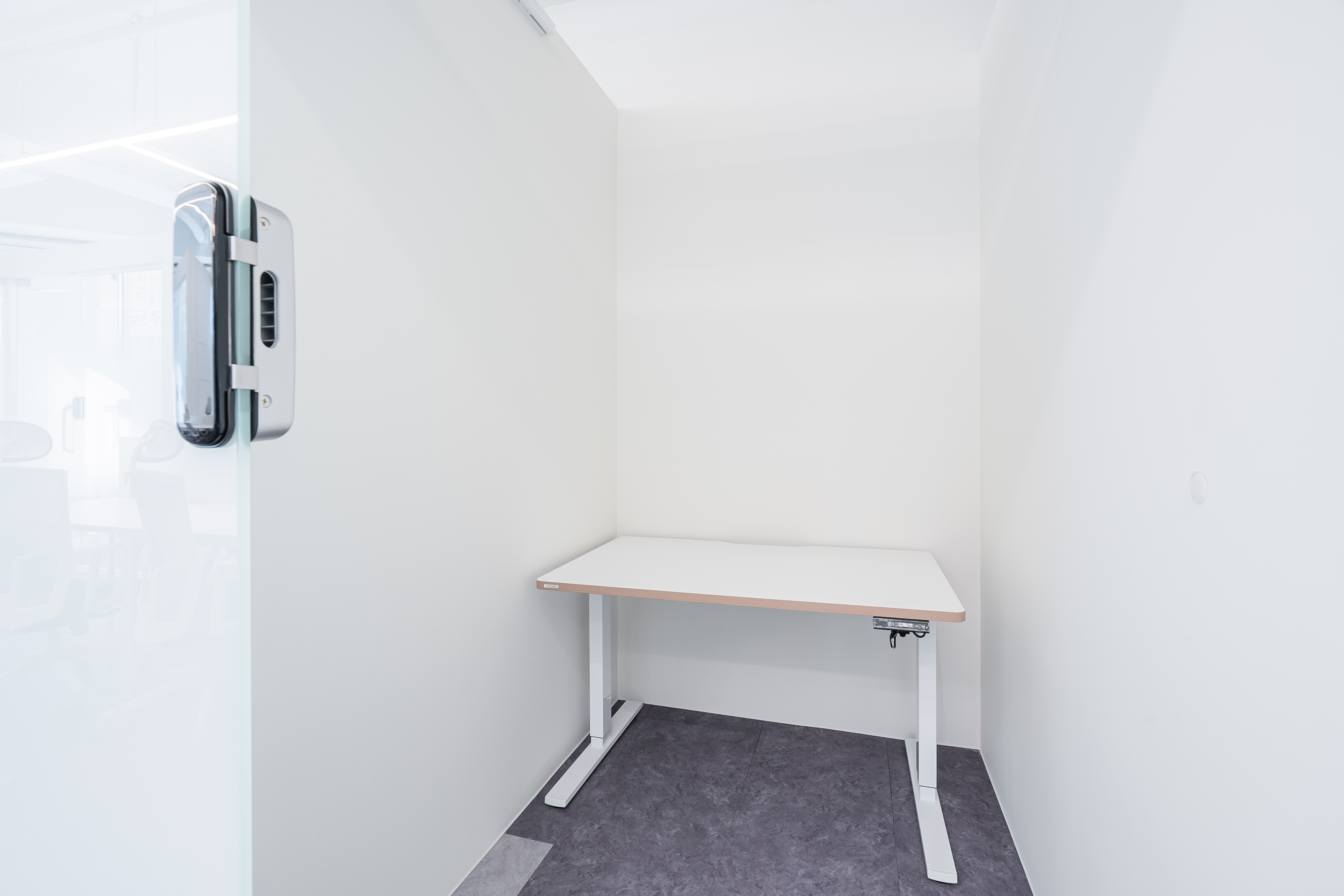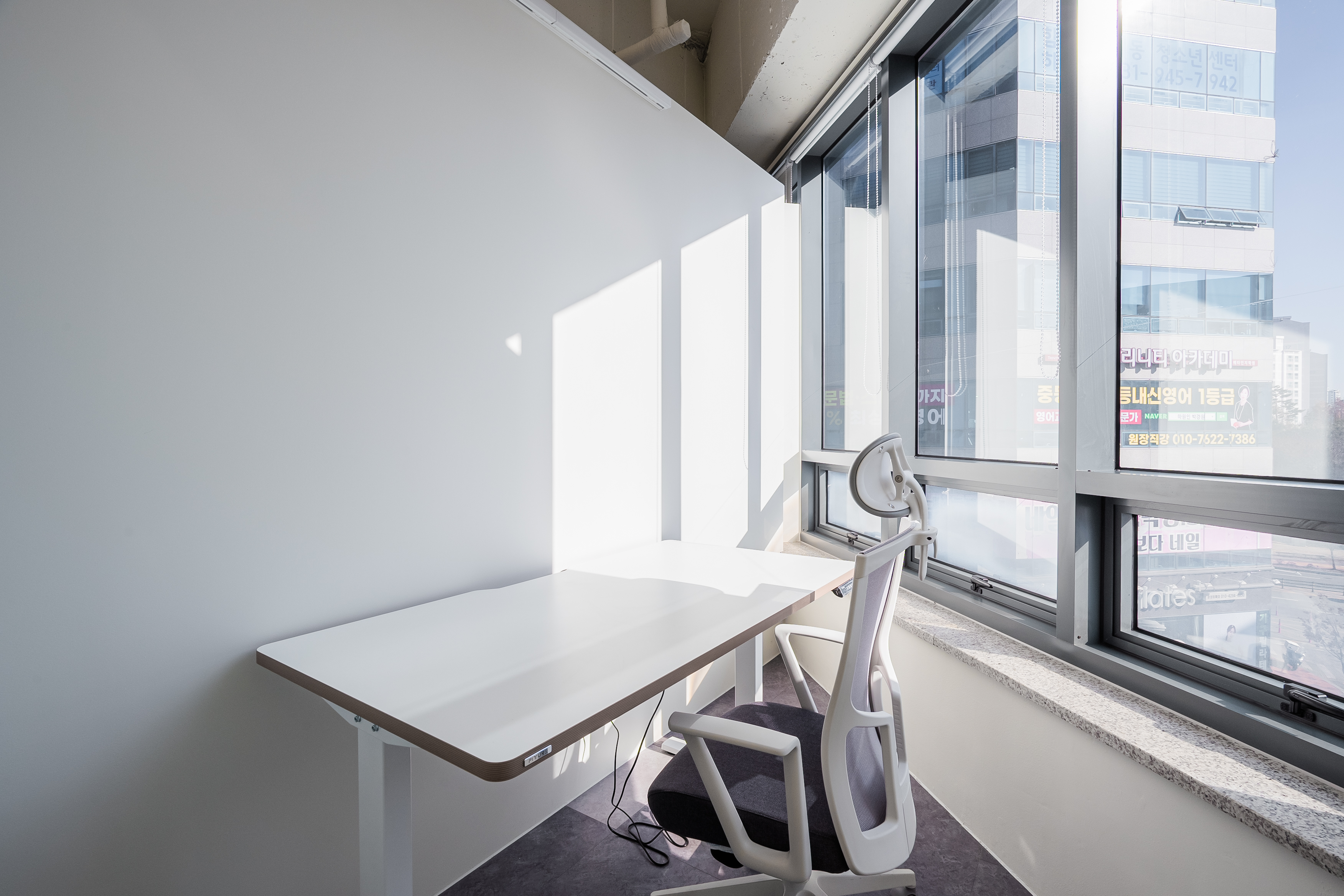 1인실은 소형 테스크와 책장, 개별 조명으로 구성되어 업무 집붕도을 높인 독립된 환경을 제공합니다.