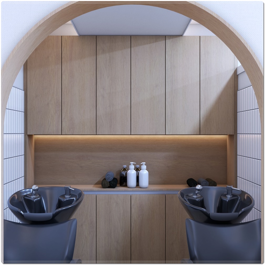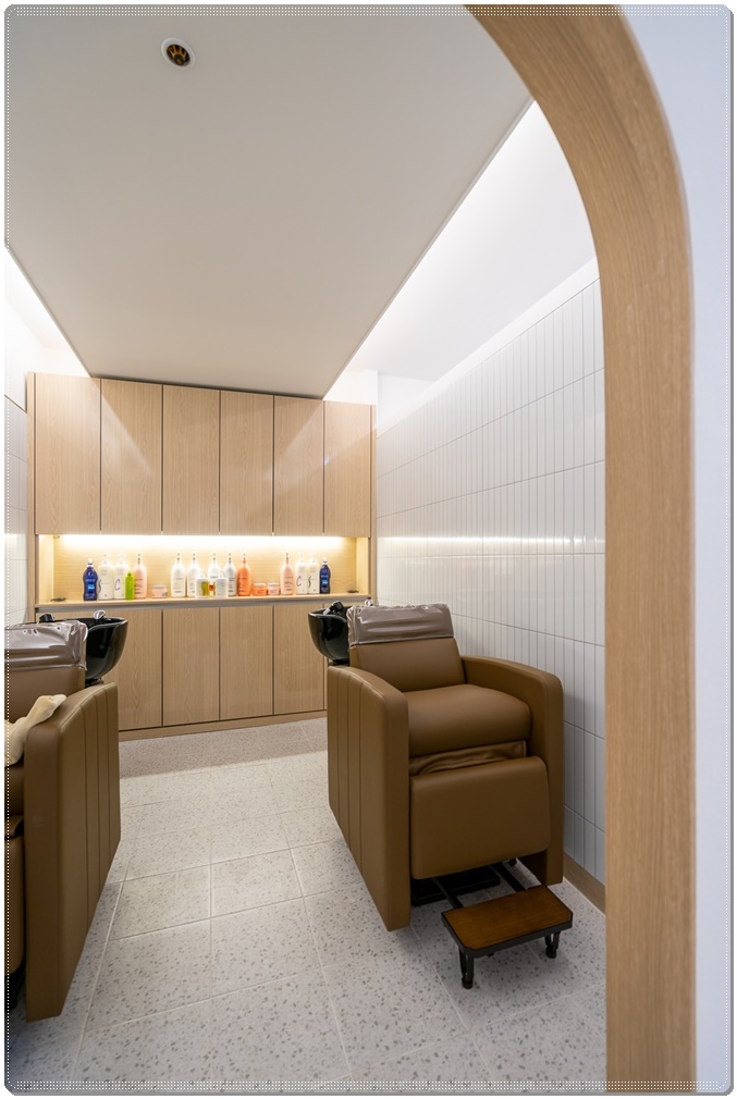 아치형 입구가 특색있는 샴푸실입니다. 아치형 문의 문틀에 우드톤을 적용해 시공했고 안쪽에는 우드 수납장과 브라운 계열의 가죽 의자를 배치해 디자인과 인테리어적으로 연결되면서 통일감이 느낄 수 있도록 연출했으며 천장에는 간접등을 설치해 샴푸를 위해 누웠을 때 눈부심이 없도록 배려했습니다.
