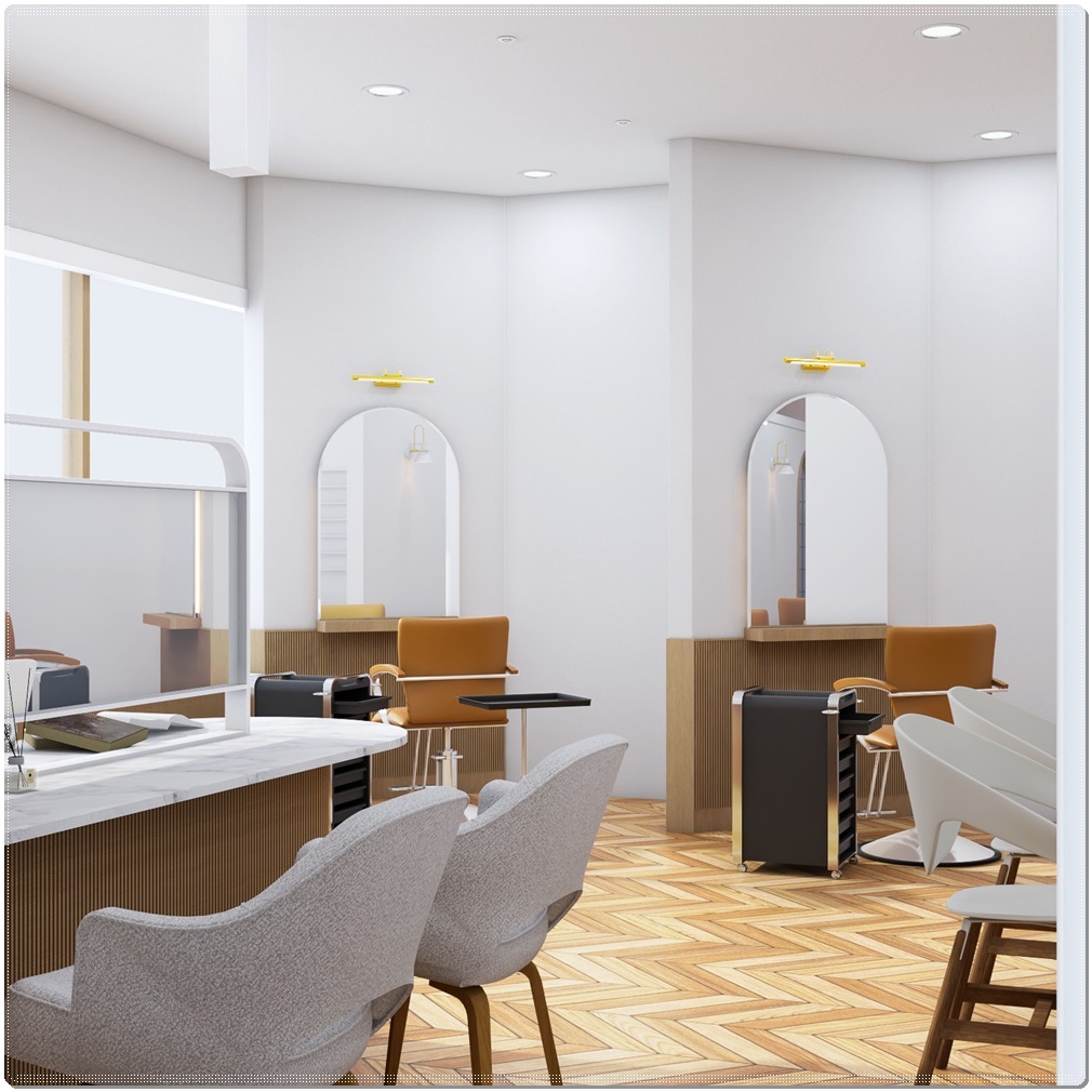 삐까번쩍하면서 웅장한 느낌의 미용실보다는 따뜻하면서 아늑한 느낌의 고급스러운 미용실로 처음 방문했을 때 쉽게 들어올 수 있고 한 번 방문하면 계속 올 수 있는 곳으로 만들어달라는 고객님의 요청을 배려해 우드 마루를 기본으로 벽면 하부, 프레임 등을 우드톤으로 디자인해 제안드렸습니다.