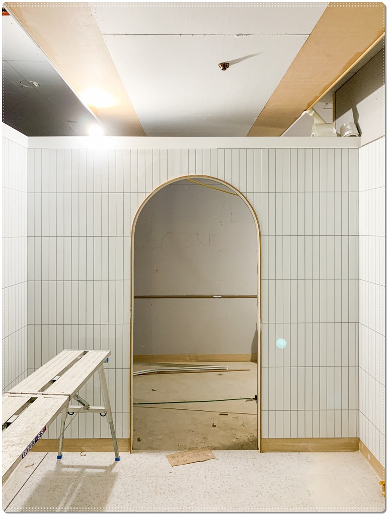 송도 배곧 미용실인테리어 중 물을 쓰는 공간 벽면에는 유지관리에 용이한 타일 작업을 해줬고 출입할 수 문은 요즘 유행하는 아치형으로 디자인해 시공했습니다. 최근 몇 년 사이 레트로와 뉴트로가 인테리어 트렌드가 되면서 주택, 사무공간, 상업공간 등에 아치형 가벽.중문을 많이 사용하고 있는데요,