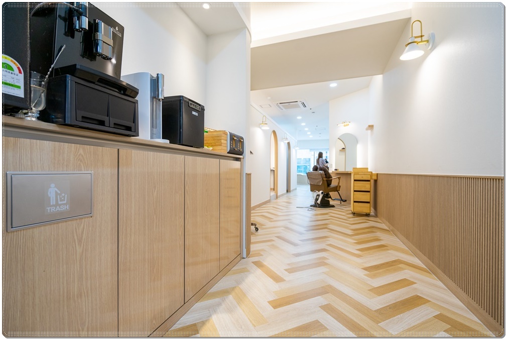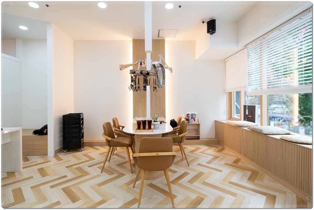 업종의 특성상 재료, 도구, 약품, 두피케어, 수건 등의 수납이 많은 미용실에는 수납 공간이 많이 필요합니다. 그래서 샴푸실, 케어실, 탕비실 등에 우드톤의 깔끔한 맞춤가구를 제작해 시공했습니다. 우드톤의 가구는 쉐브론 패턴의 마루바닥과도 너무나 잘 어우러져 고급스러운 느낌이 드네요.