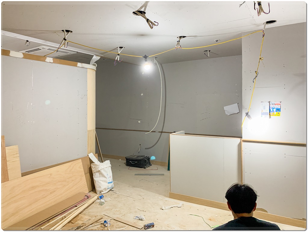 소형평수이지만 대기 공간, 시술 공간, 샴푸 공간, 케어 공간, 네일아트 공간, 탕비 공간 등으로 공간을 구분해 설계해야했기 때문에 우선은 공간을 나누는 일을 먼저 진행했습니다. 대기 공간에는 세팅 기계를 천장에 설치할 수 있도록 배선을 추가로 공사했습니다. 그 외에도 각 공간마다 조명과 전기를 사용해야 하고 쾌적한 환경을 만들어야 하므로 배선, 공조시스템, 소방설비 등을 확인 후 공사를 진행했습니다.
