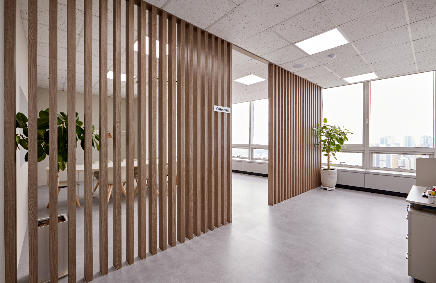 직원들의 휴식을 책임지는 카페테리아 공간은 원목 파티션으로 우선 분위기를 전환하는 포인트를 가지고 있습니다. 온통 화이트와 그레이톤이었던 흑백세상에서 마치 따뜻한 색감으로 넘어가는 경계선과 같은 느낌을 내주는데요.