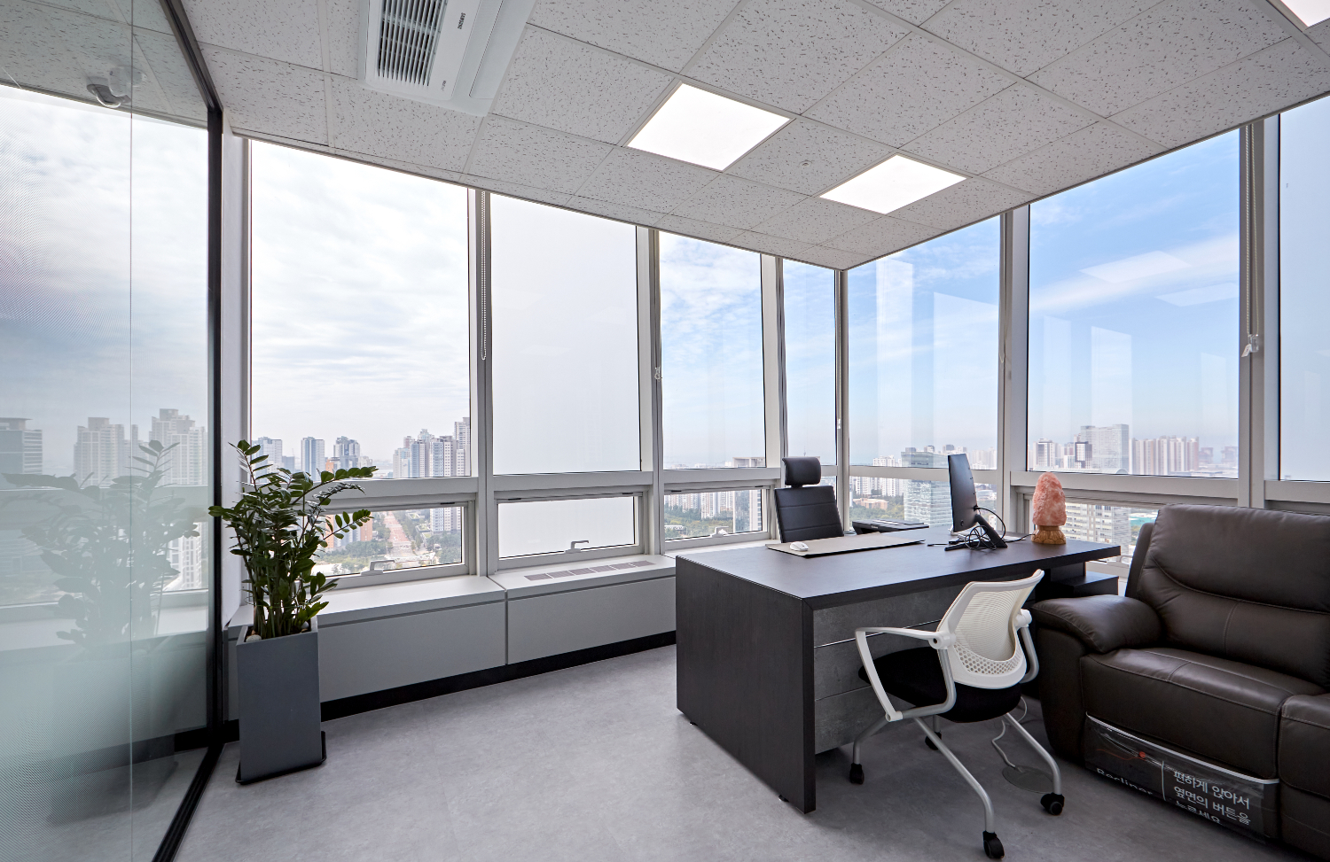 CEO룸은 약간 ㄷ자형 구조였기 때문에 이를 보완하기 위해 가구 배치를 신경 썼습니다. 가구를 입구를 바라보게 배치하기에는 활용할 수 있는 공간이 한정적이라 창을 등지고 앉는 형태로 배치하여 충분한 여유 공간이 생겼습니다.글라스월 중앙에는 그라데이션 시트지를 부착하여 프라이빗한 공간으로 구성을했습니다.