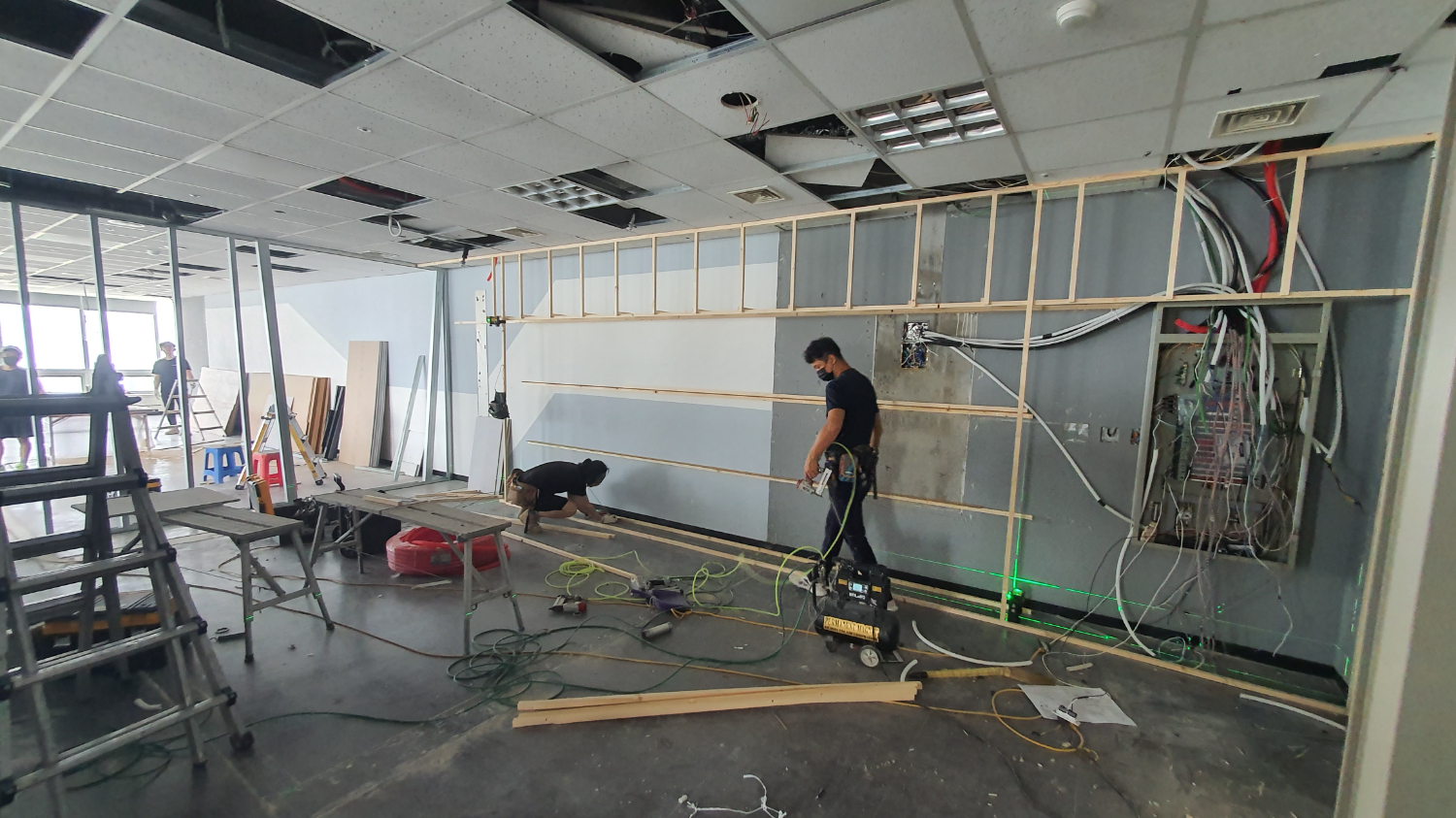유리 파티션 옆 석고와 에어컨 위치 타공,미장 작업을 진행하는 모습입니다.3D디자인과 레이아웃으로 정확한 위치를 파악 후 시공하고 현장에서도 계속해서 커뮤니케이션을 하기 때문에 보다 수정할 사항이나 로스를 최소화하고 있습니다.