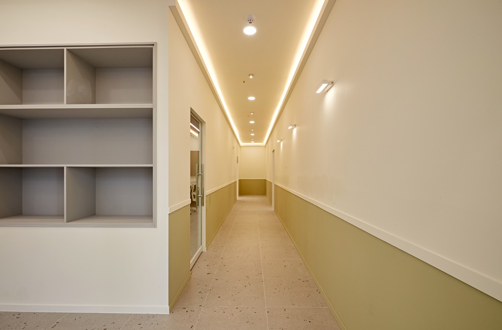 복도에는 따뜻한 색조의 조명을 선택해 직원들에게 편안함을 제공할 수 있도록 했는데요.