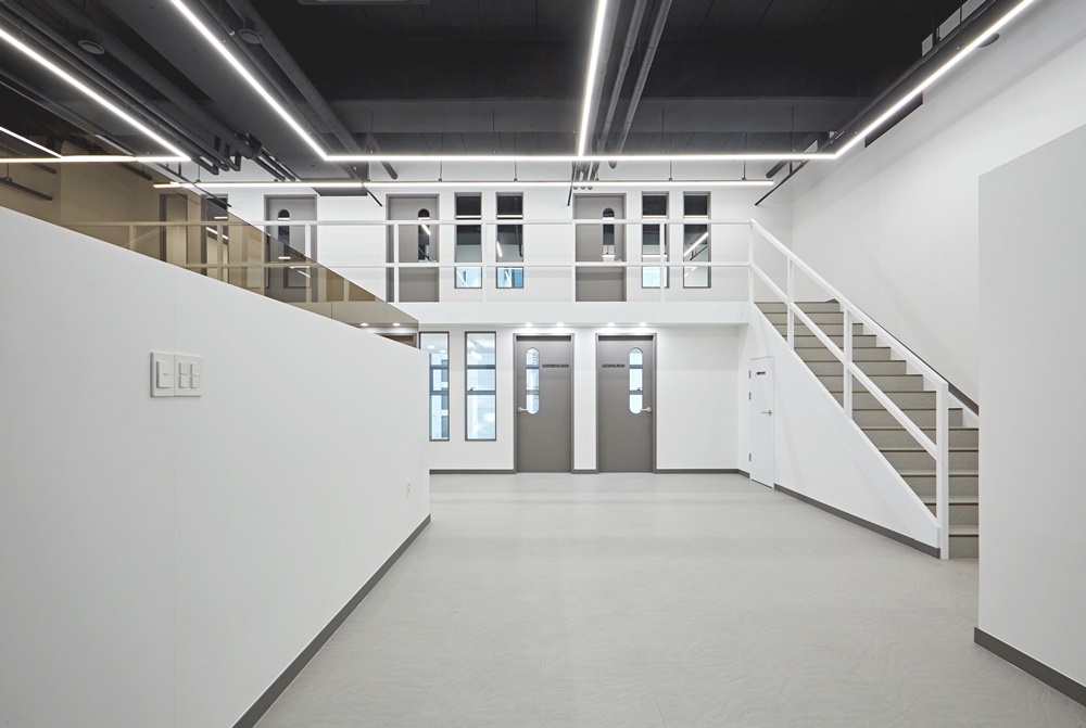 계단은 화이트 톤으로 군더더기 없이 떨어져 있어 사무실 전체 톤과 자연스럽게 연결되었어요.