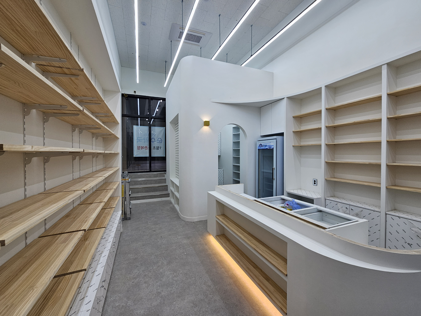 이번 수원상가인테리어에서는 화이트 컬러의 목재 프레임과 내추럴 우드 선반을 조합하여