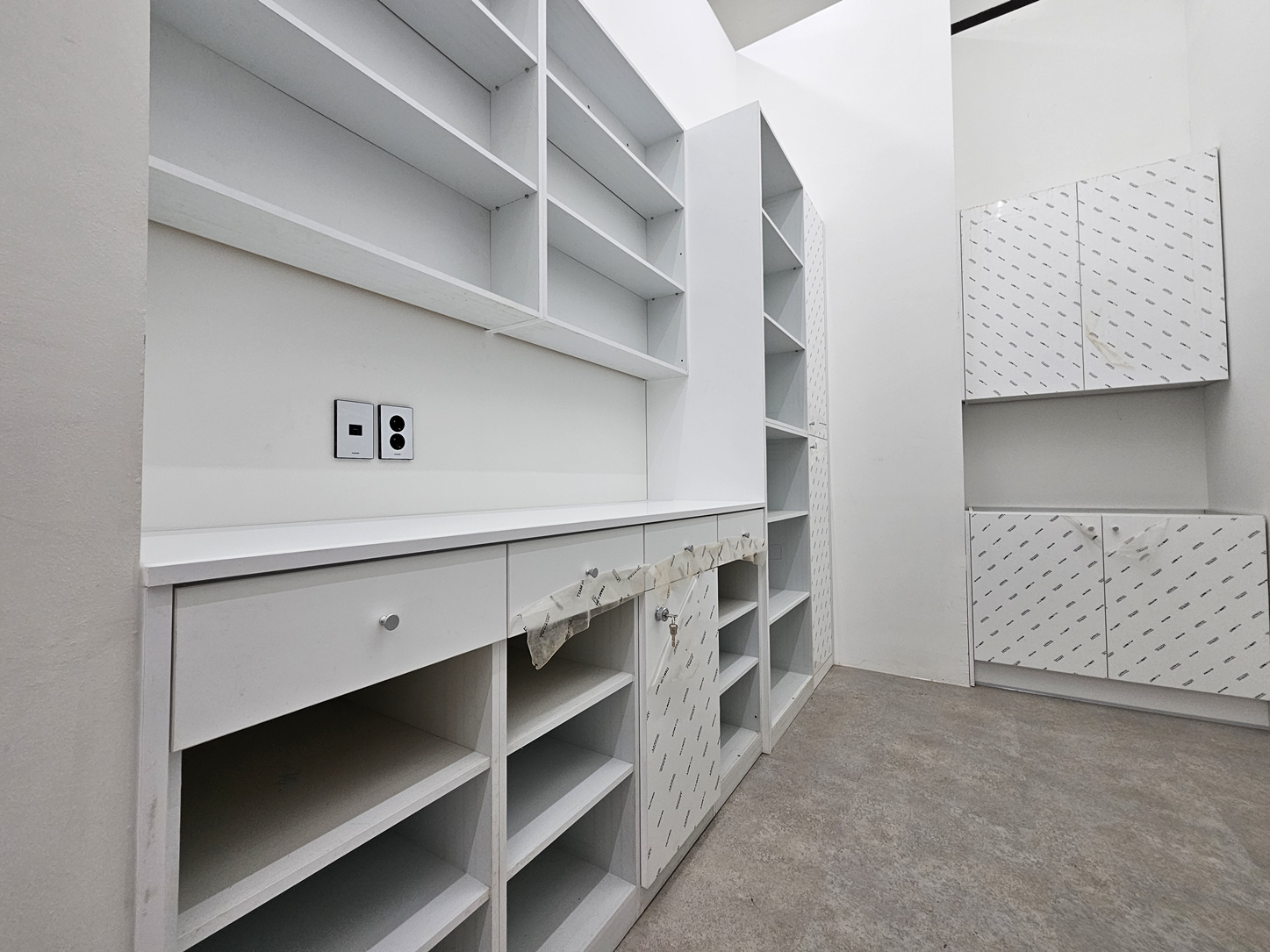 화이트 톤으로 마감한 선반과 서랍장은 먼지와 오염이 쉽게 눈에 띄지 않도록 제작되었고,