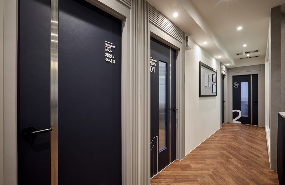 복도 벽면은 전체를 화이트로 마감하는 대신, 일부 벽면에 학원의 상징색인 딥 네이비 컬러를 과감하게 적용했습니다.