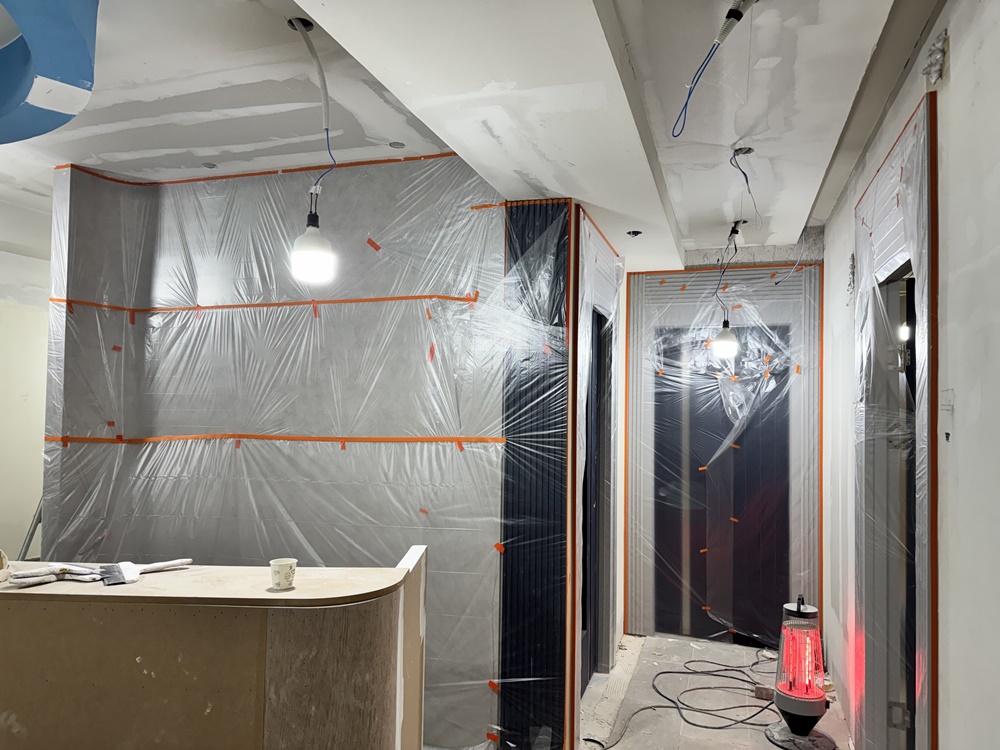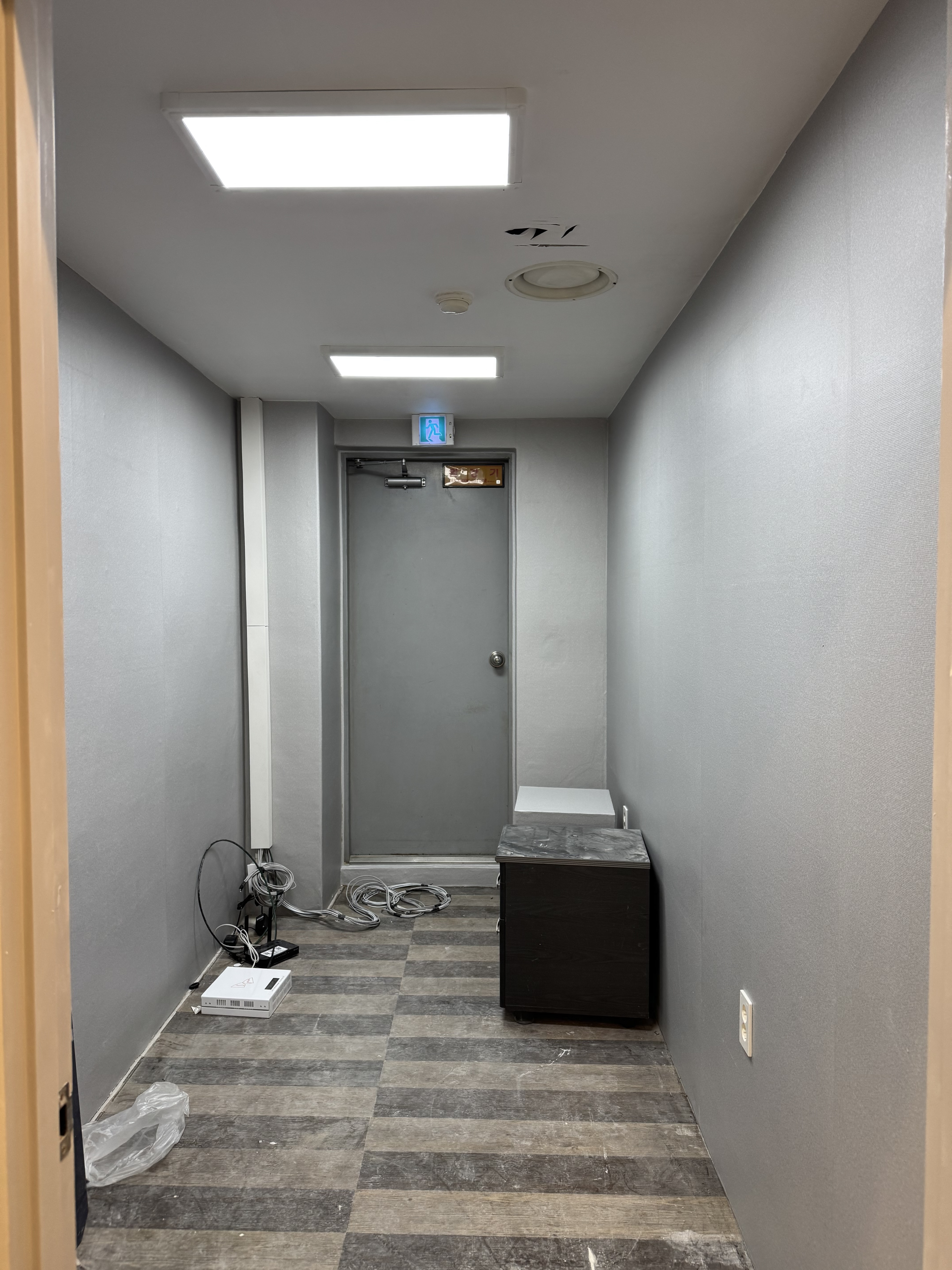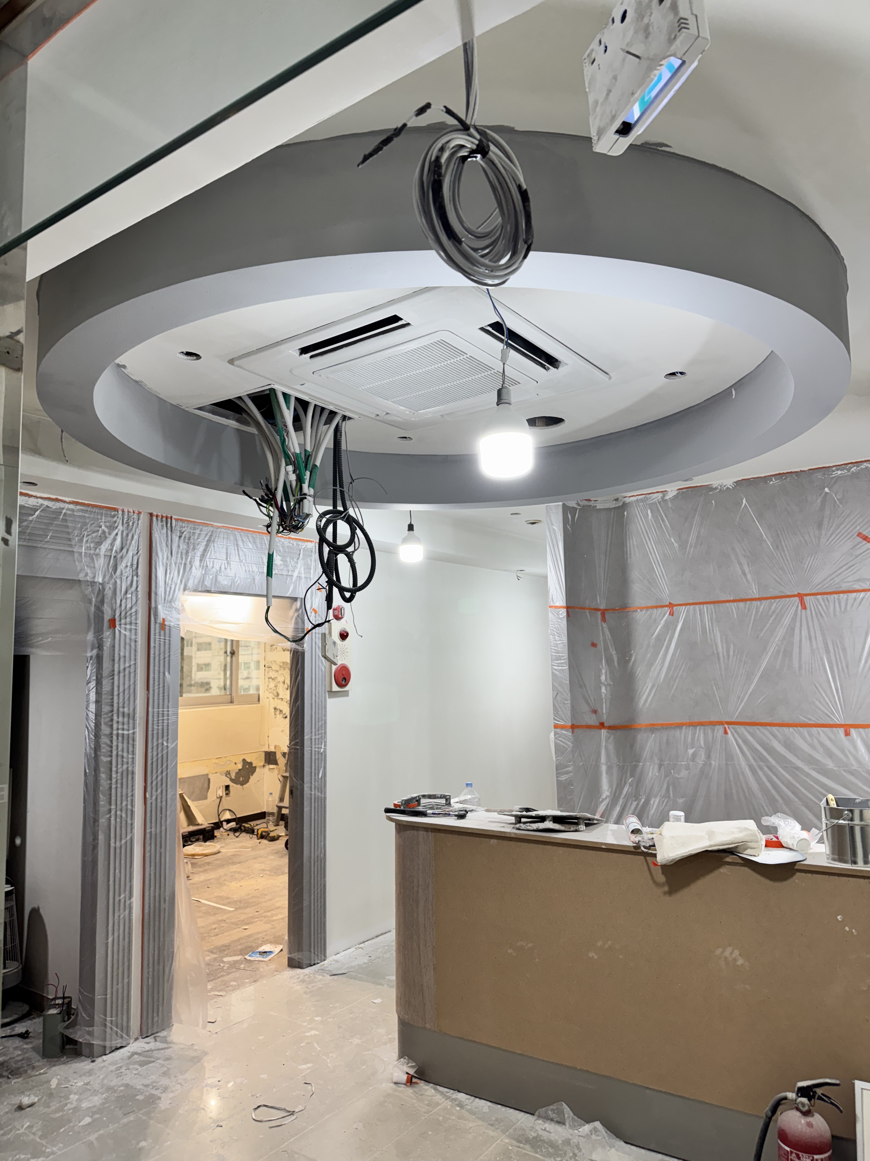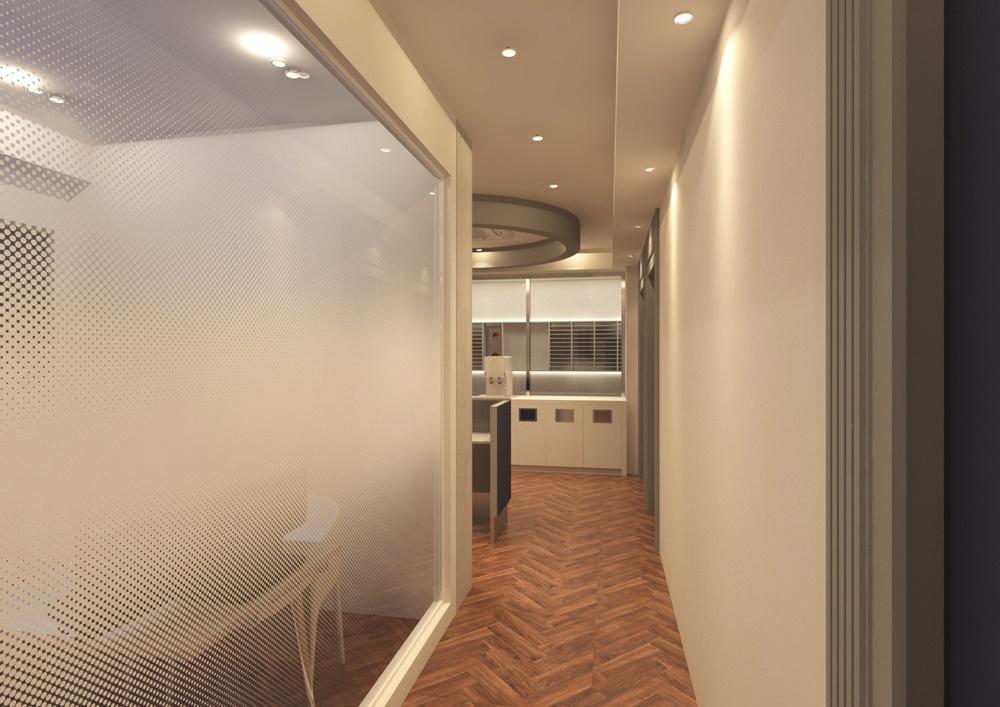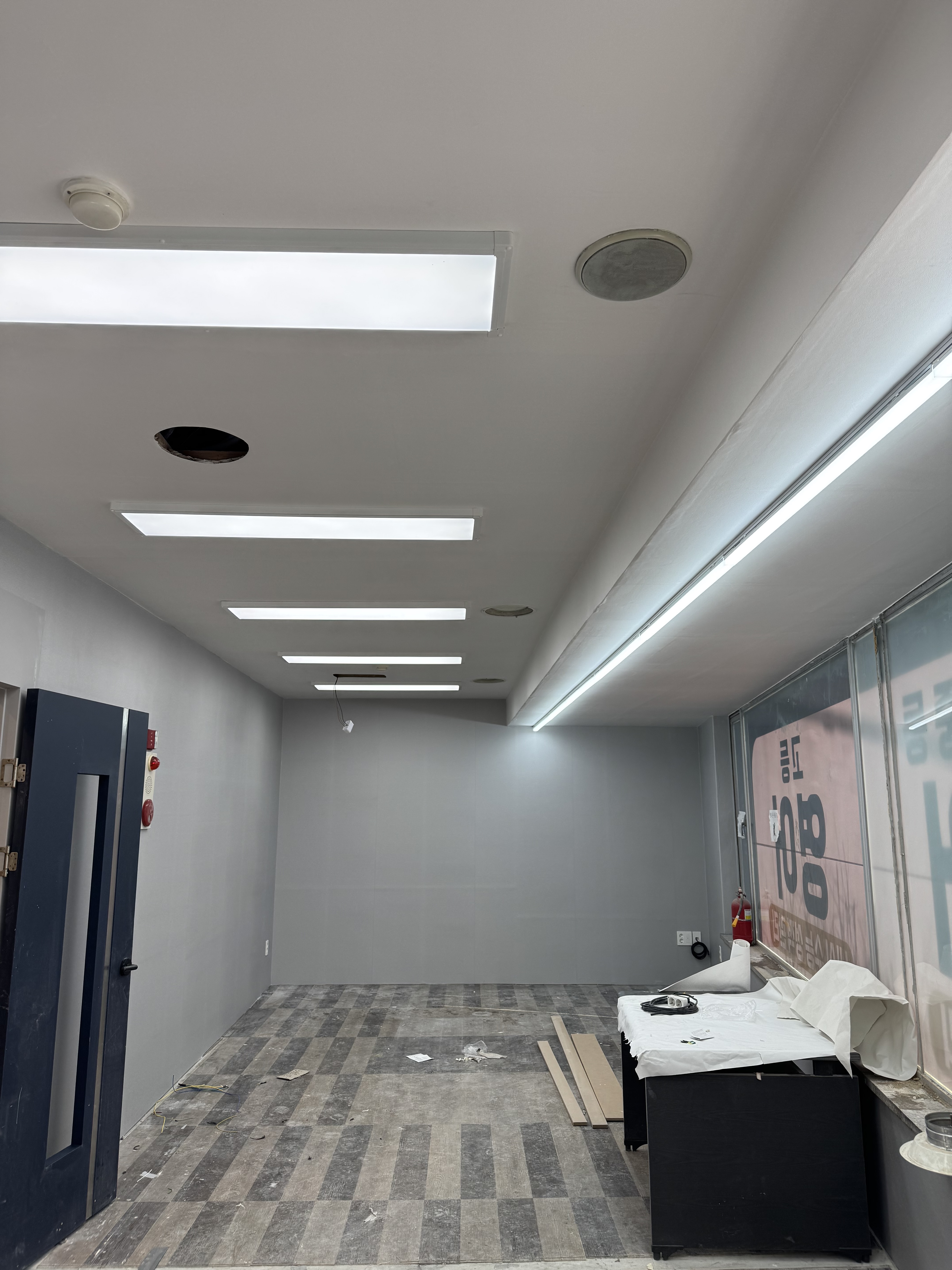 복도는 좁고 답답하다는 편견을 깨기 위해 이번 수원상가인테리어 현장에서는 복도 벽면의 일부를 과감하게 통유리(강화유리) 파티션으로 교체했습니다.