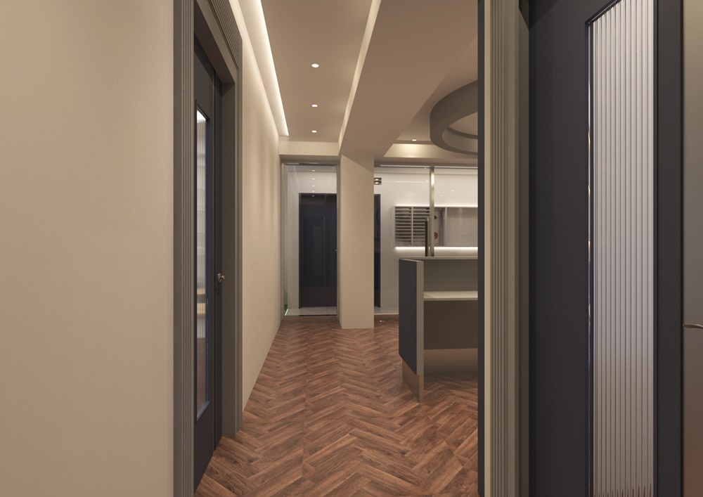 비정형적인 대각선 라인을 따라 네이비 컬러를 배색하여 자칫 지루해질 수 있는 긴 복도에 생동감을 불어넣습니다.