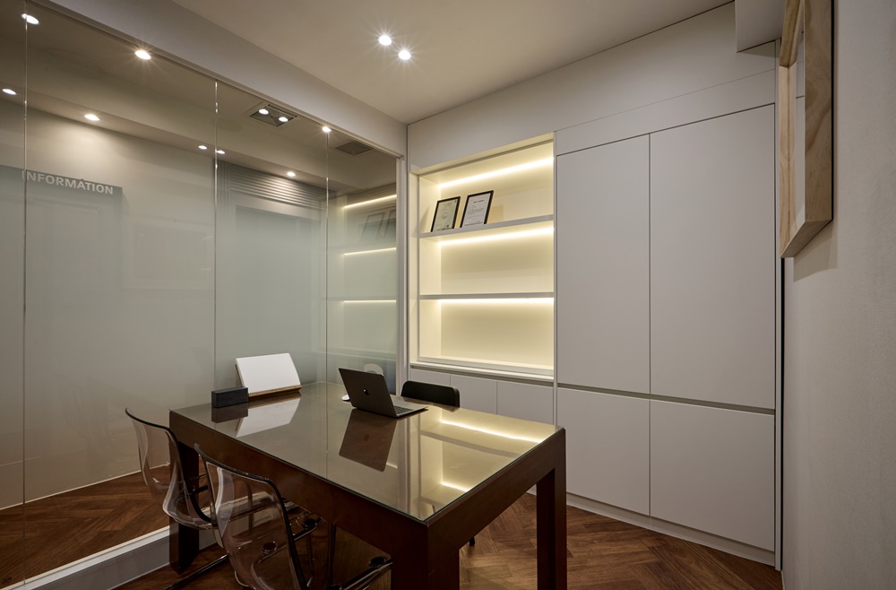 상담실은 복도 쪽 벽면을 통유리 파티션으로 시공했습니다.