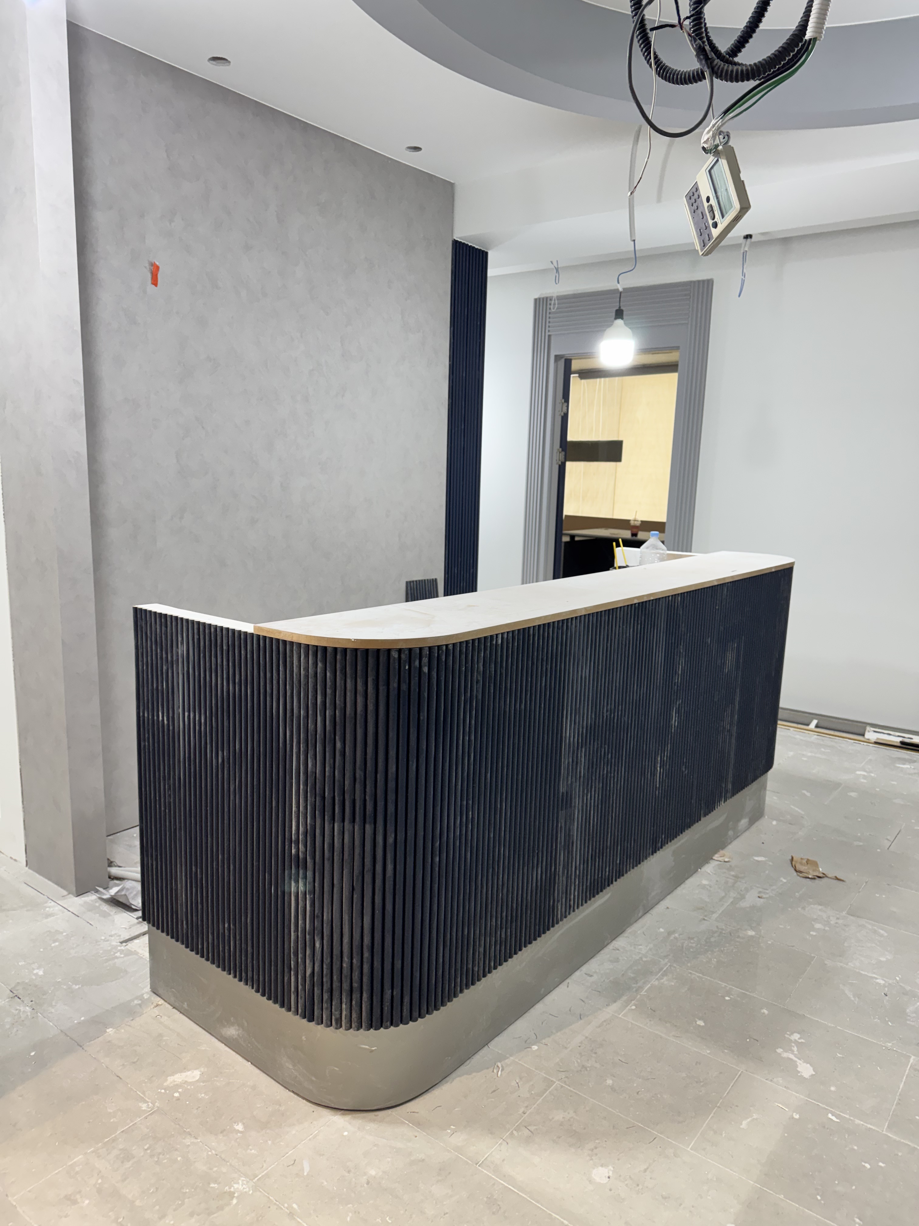 인포메이션 데스크 전면에 네이비 컬러의 템바보드를 시공했습니다.