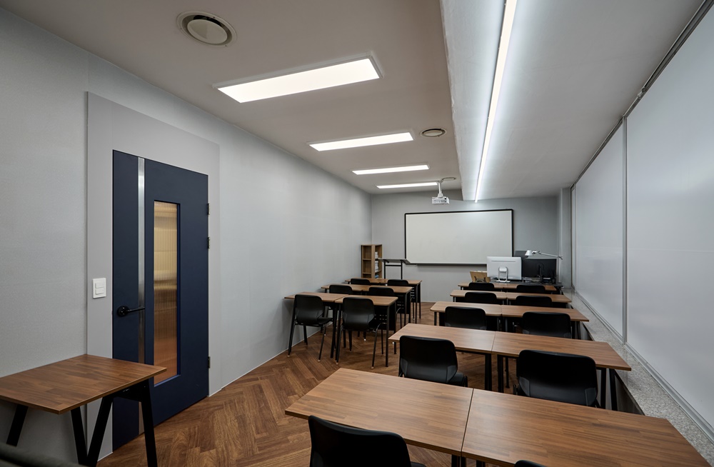 강의실 천장에는 그림자가 지는 사각지대를 없애기 위해 촘촘한 간격으로 매립형 다운라이트를 배치했습니다.