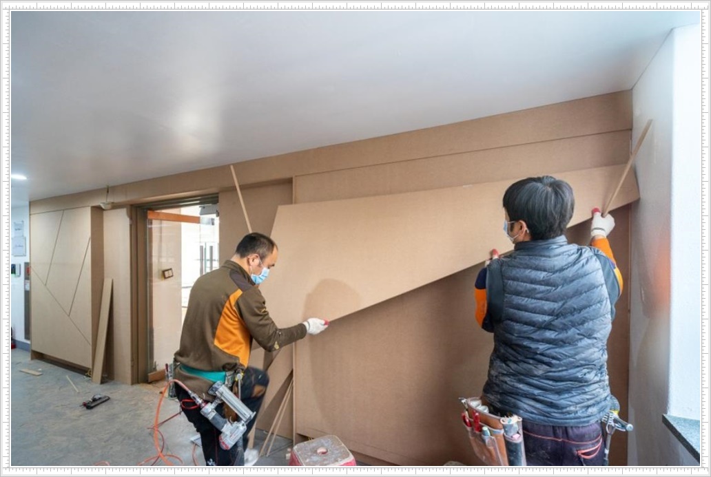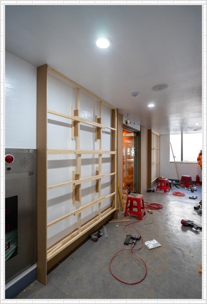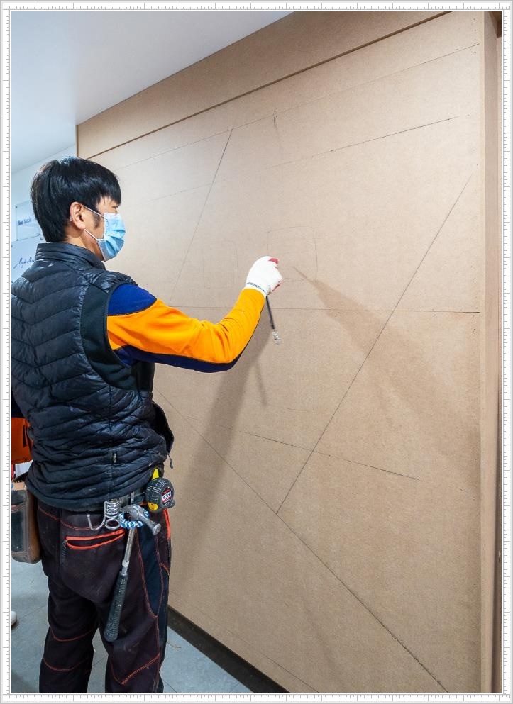 그럼 지금부터 수원시 호매실동 프리마 비즈타워 사무실인테리어 파사드 공사 후기!를 시작해 볼까요?우선 방화문 주변에 합판을 설치해 디자인 도안 그대로 제도를 하고 새로운 합판을 다시 그려 정확하게 재단한 뒤 벽면 위에 덧붙입니다. 이번 디자인은 사선과 면의 패턴이 특징인 모자이크 작업 같은데요, 그 덕분에 지루할 수 있는 벽면에 변화를 줄 수 있었고 세련되고 감각적인 디자인을 완성할 수 있었습니다.
