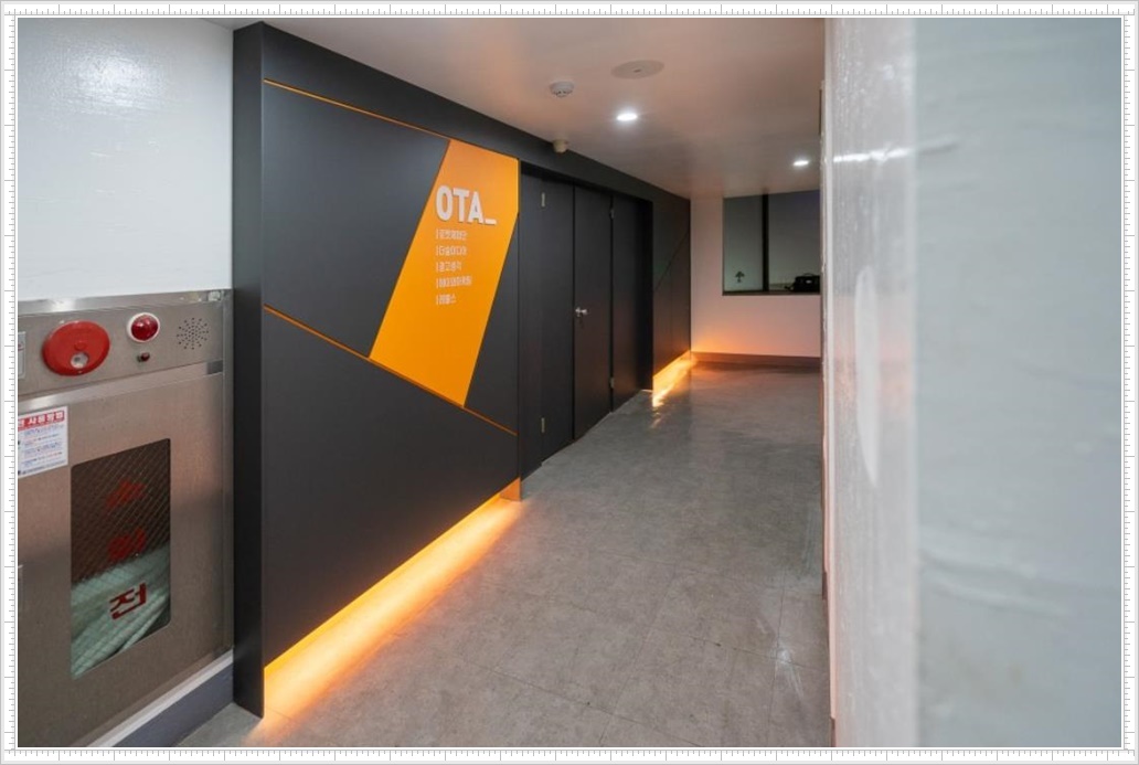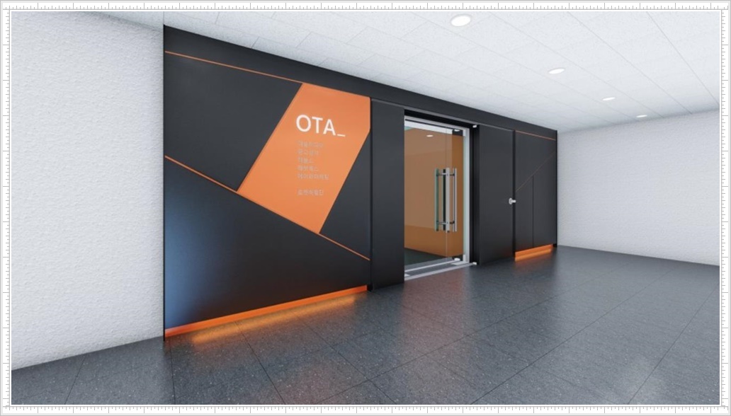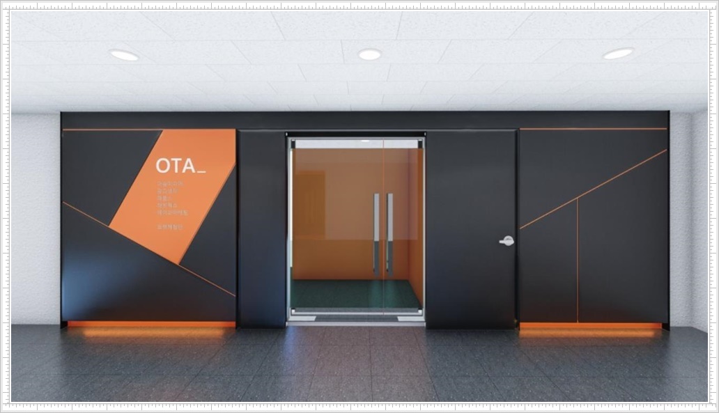 특히, 복도식으로 밀집해 있는 건물에서 입구 파사드는 회사 이미지를 대표할 수 있기 때문에 신뢰할 수 있는 회사로 보이기 위해서나 사람들의 시선을 사로잡기 위해서 효과적인 디자인을 선호합니다. 이번 현장은 고객님의 요청으로 블랙 컬러를 도어에 적용하고 포인트가 되는 오렌지 컬러를 지정해 패턴과 라인에 적용해 입체감있는 모습이 되도록 계획했으며 간접조명을 적용해 화려하지만 과하지 않는 세련된 모습을 연출하도록 했습니다.