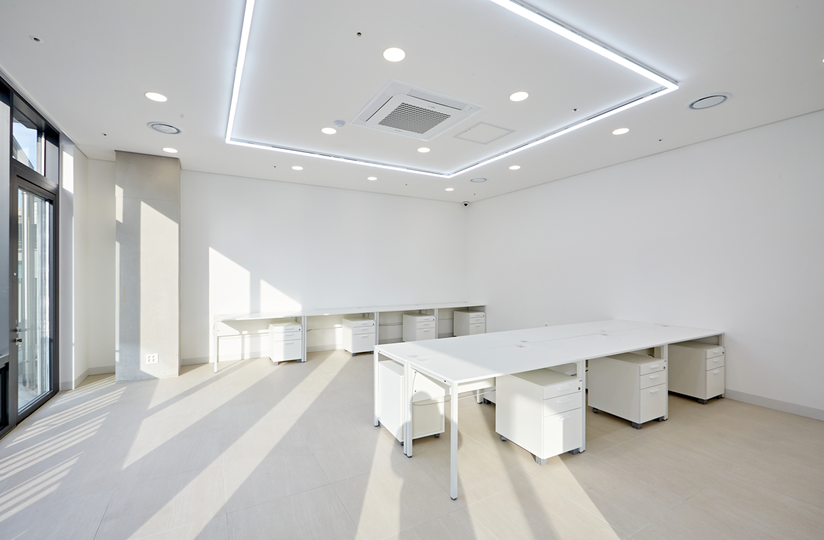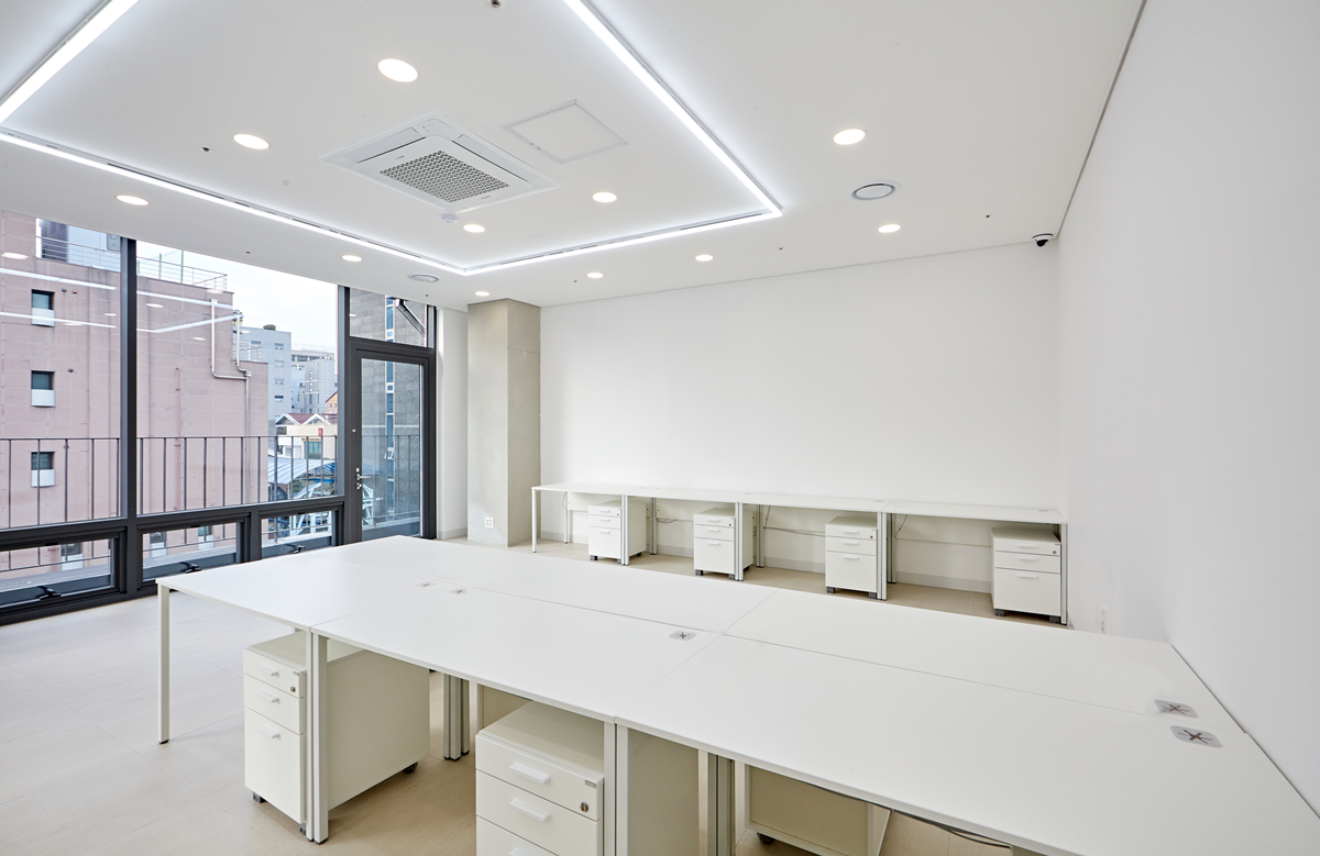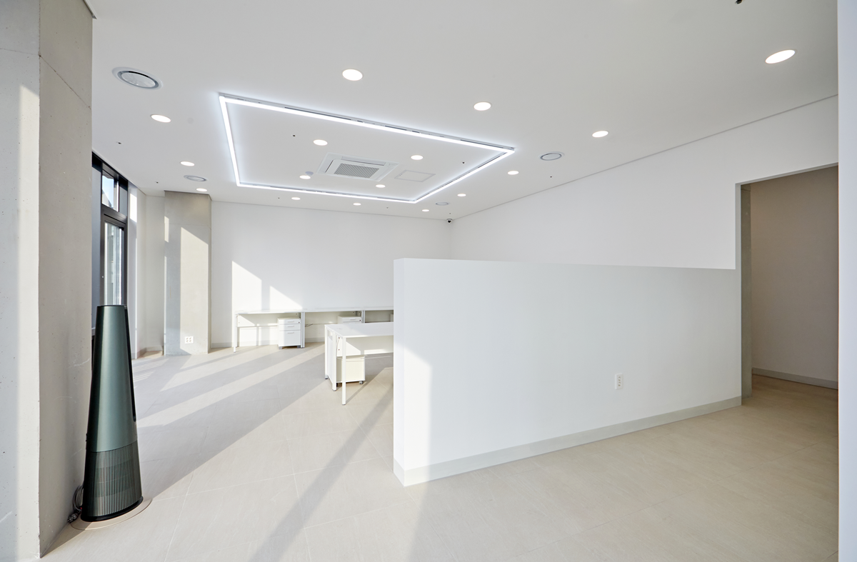 밝은 조명은 공간을 넓어 보이게 하고 업무 효율을 높여주는데 천장에 매입등을 설치하거나, 스포트라이트를 활용하여 강조하고자 하는 부분을 밝게 비추는 것도 좋은 방법 입니다.