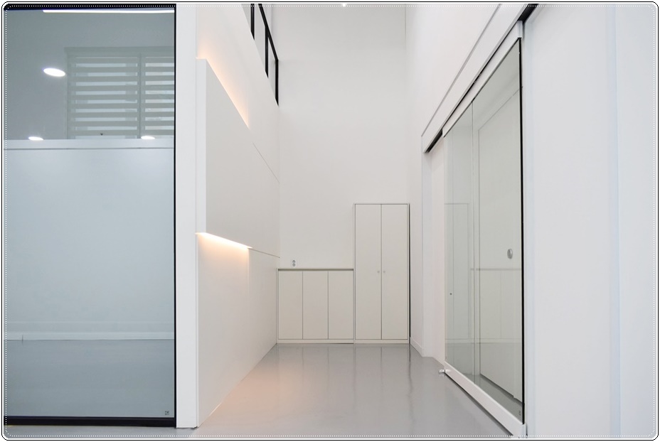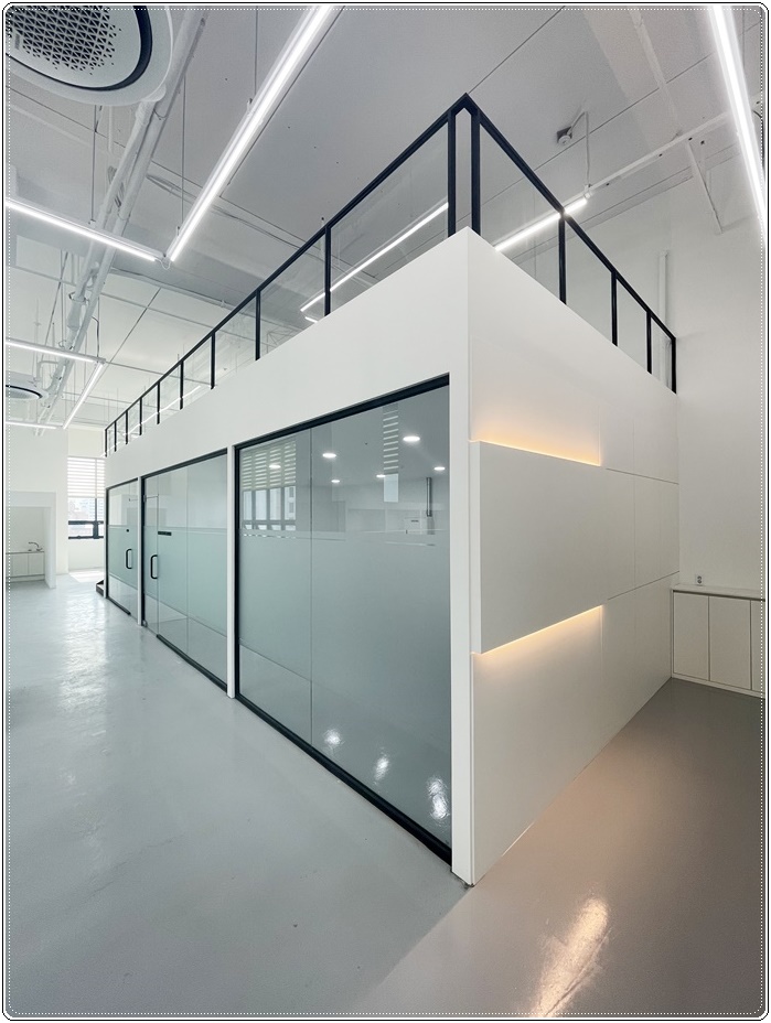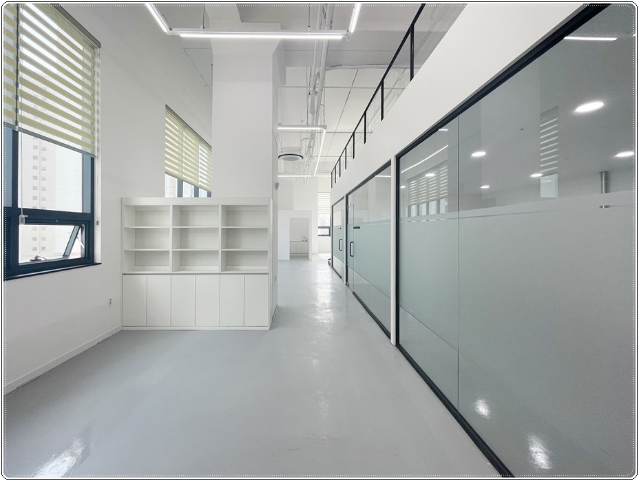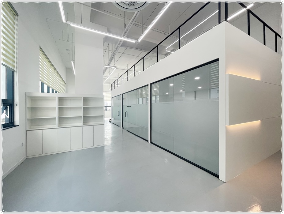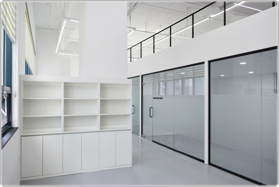 복층의 하부 공간은 업체의 특성에 따라 기능을 부여할 수 있겠죠. 이 곳은 하부 공간에 대표실과 회의실을 배치해 외부 방문객의 동선을 제한함으로써 효과적인 관리를 할 수 있도록 해드렸습니다. 보안이 중요한 업체일수록 방문자 영역과 직원 역역을 명쾌하게 분리하는 것이 중요하기 때문에 이렇게 복층을 시공해 동선을 제한한다면 방문객을 관리하는데 매우 효과적이랍니다.