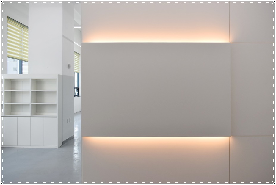 내부 파사드 또한 외부 파사드의 면디자인을 적용해 통일성을 이루면서 익스테리어와 인테리어를 자연스럽게 이어주는 매개체가 되도록 했습니다. 벽면에 또 하나의 직사각형 디자인 면을 단차가 있게 시공해 조명을 적용함으로써 은은한 분위기를 조성하면서 라인 디자인도 더해지는 효과를 줌으로써 임팩트를 줬습니다. 여기에 감각적인 느낌으로 업체명 및 로고 사인물을 시공하면 가독성과 인지성을 높일 수 있겠죠.