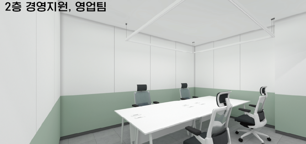 소회의실은 3명이서 각자의 테이블에 효과적인 소통을 이룰 수 있도록 배치하였습니다. 그리고 벽에는 화이트 보드와 하늘색 포인트로 마감하였으며 외부와는 다르게 매트한 질감의 바닥재로 변화를 주었습니다.