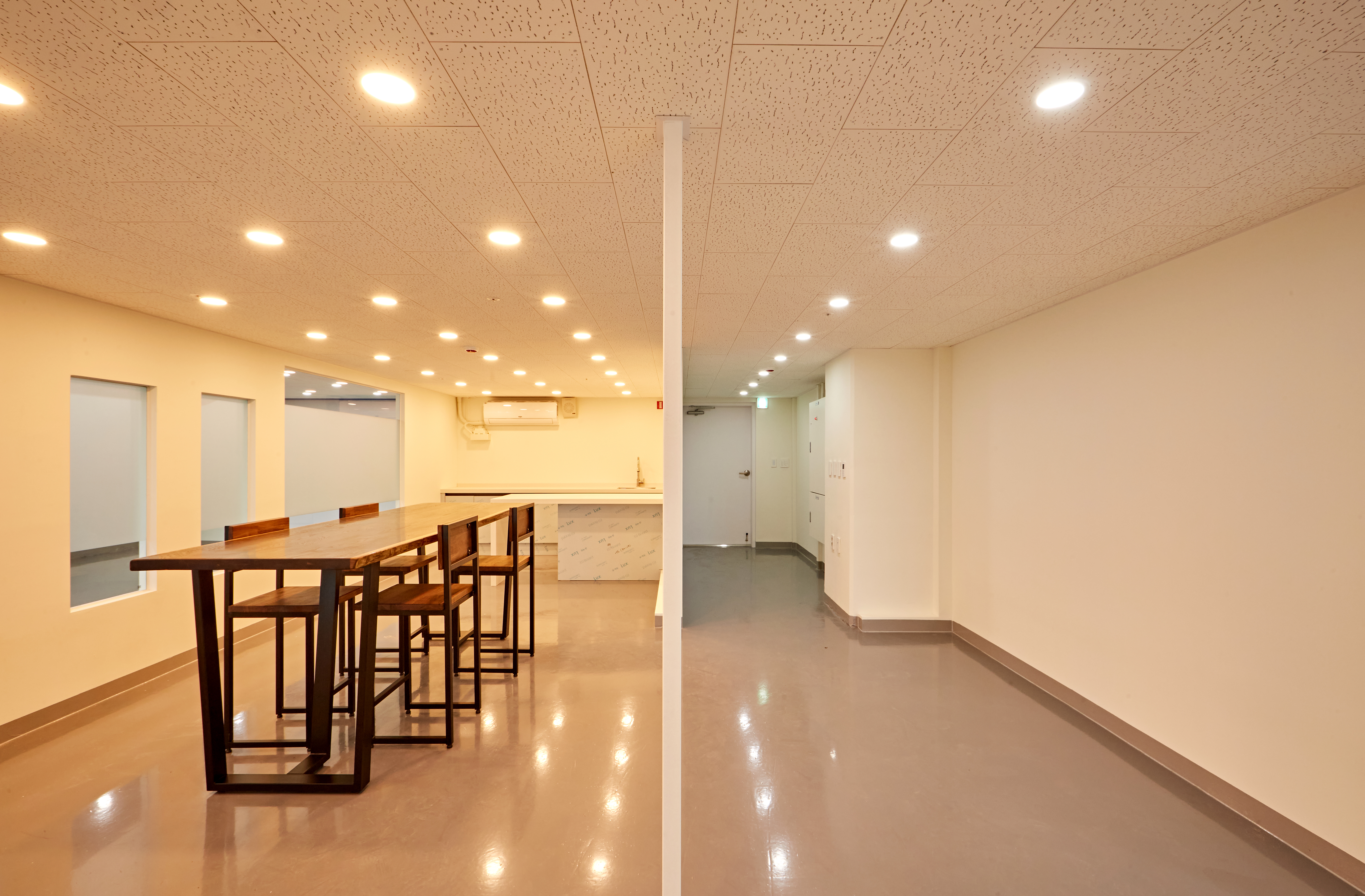 그 옆으로는 광활한 복도가 보여지며 그레이 유광 재질로 바닥을 시공하여 세련된 분위기를 마주할 수 있습니다. 또한 전체 천장이 존재하지 않고 2층까지 노출 천장 시공이 이뤄져있어 주조명 없이 라인 조명과 보조등이 설치되었는데요.