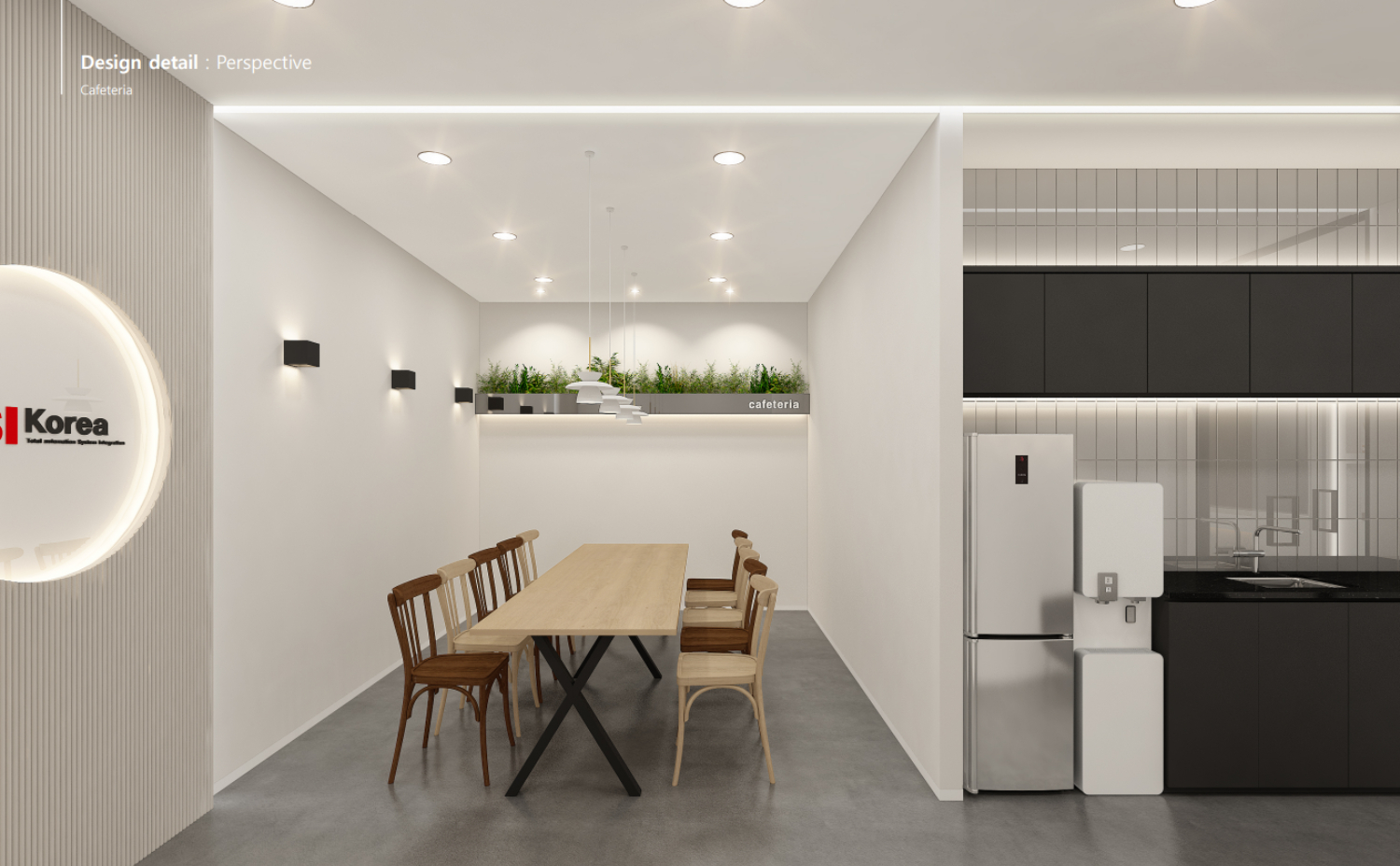또한 복지 증진을 위한 카페테리아 공간도 잊지 않았으며, 물론 지식산업센터의 경우 자체적으로 준비된 휴게 공간이 많다고는 하지만 내부에서도 편하게 쉴 수 있도록 별도로 마련하고 싶으시다고 하셨습니다. 그리고 통창을 잘 활용하여서 트인 느낌을 연출하였습니다.