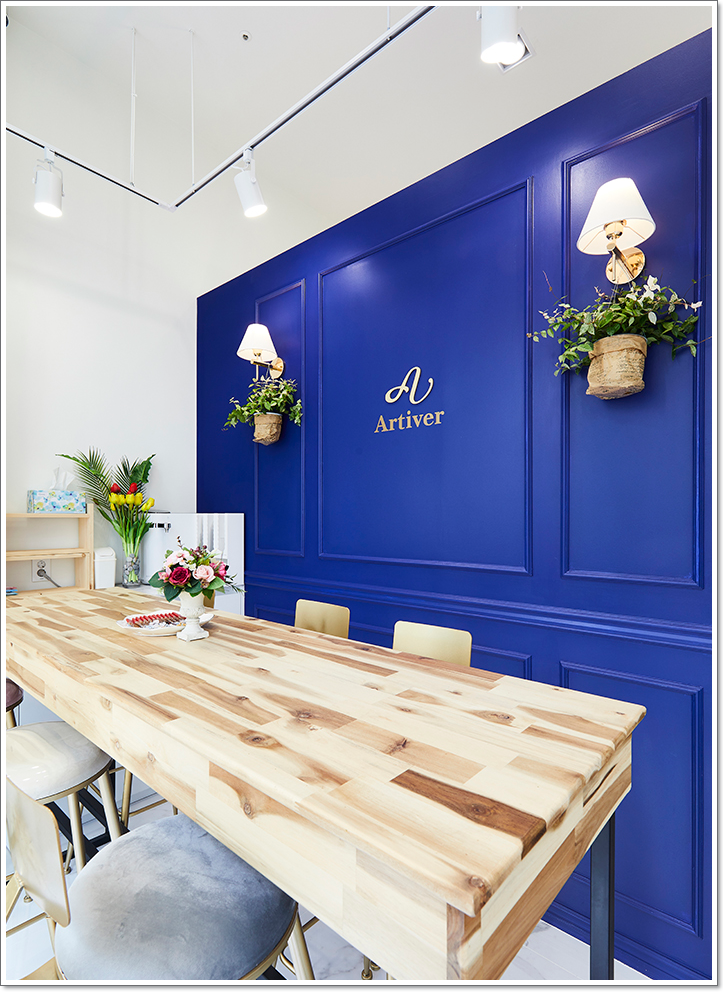 가게 내부 또한 간판에 있는 글귀를 이용한 우아하고 아름다운 분위기를 이어나가보았으며 지금 사진에서 보이는 외벽이 가게의 구석구석에서 중요한 포인트를 담당하고 있는 블루톤 색감의 외벽이라고 할 수 있습니다. 외벽 또한 그저 평범한 외벽이 아니라 웨인스코팅이라는 몰딩 기법을 이용해서 벽의 우아함을 살림과 동시에 벽이 넓어보이기도 하고 유럽풍으로 느껴지게도 만들고 있습니다. 뿐만 아니라 조명도 분위기 조성을 하는데 고조시키고 있습니다.
