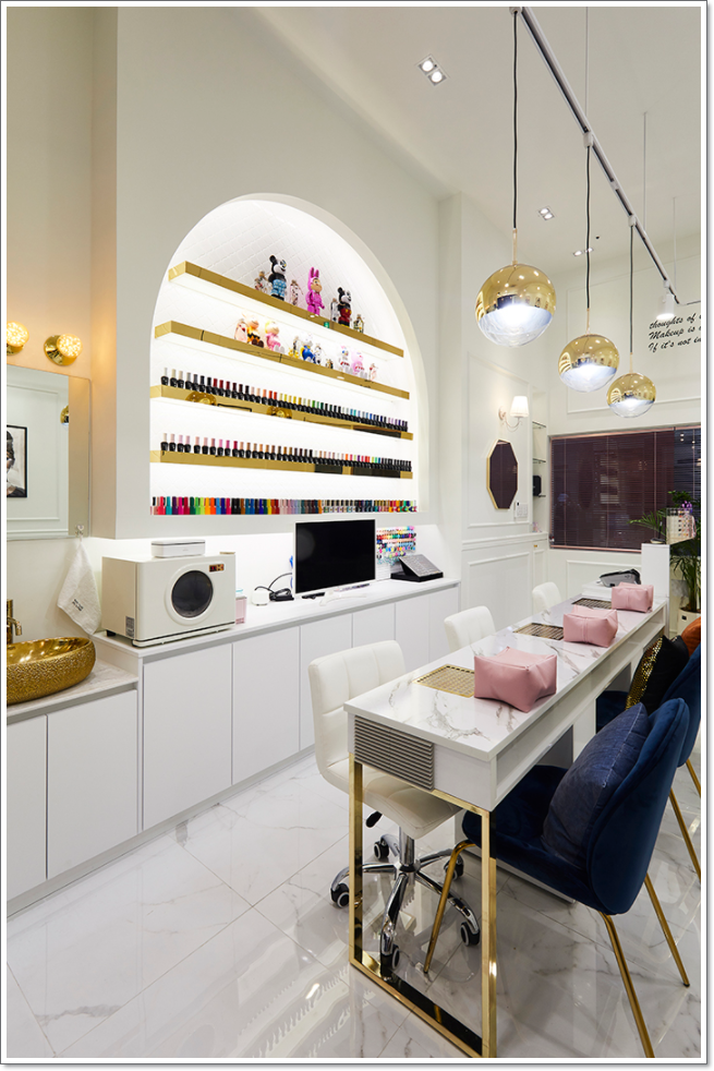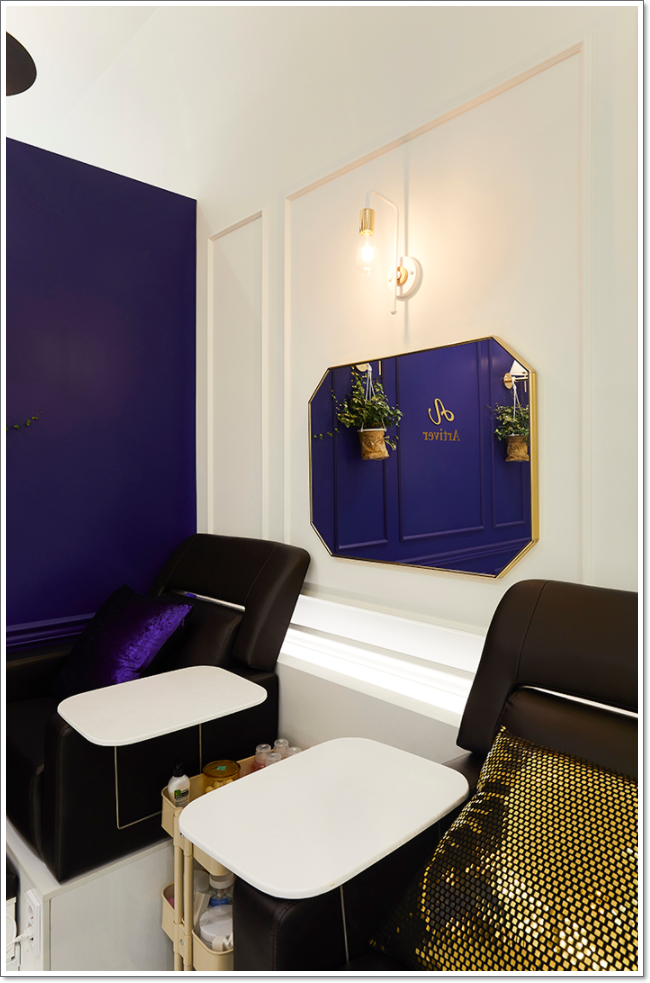 이처럼 916 디자인은 자칫하면 좁아보일 수 있는 네일샵의 공간 구성을 색채의 조화와 포인트 요소를 이용해서 돋보이게 구성해보았습니다. 작업 공간 같은 경우에도 고객이 이를 이용함에 있어서 부담스럽지 않고 시선을 여러 곳으로 향하게 할 수 있도록 불릴만한 구성을 많이 추가하였으며 시선을 정면으로 고정시키지 않고 자유 분방하게 돌림으로 조금 더 편안하게 느껴지실 것입니다.