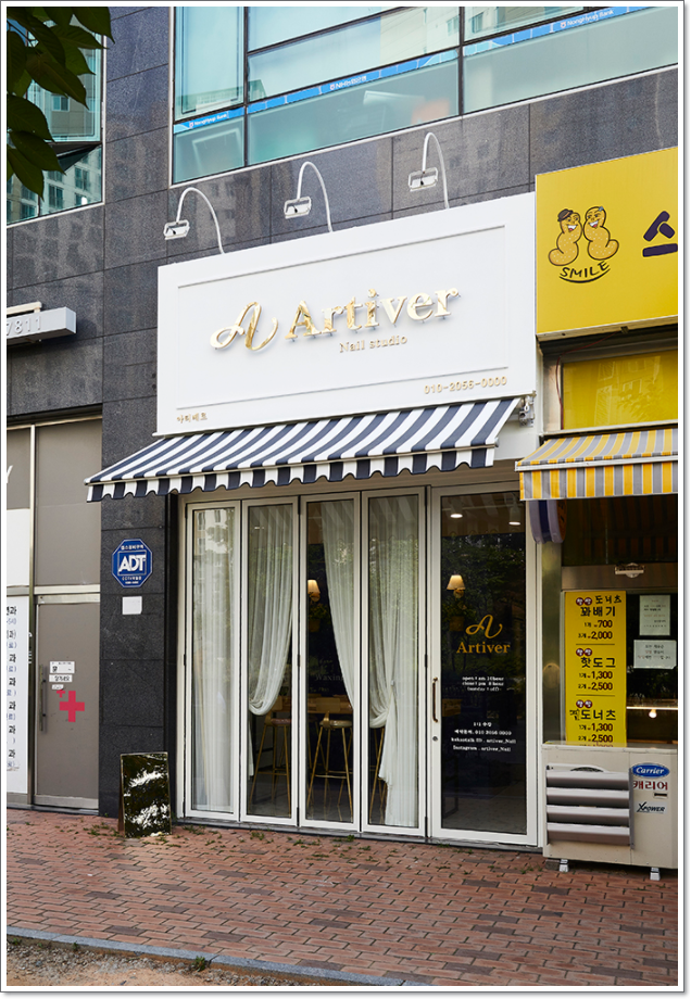 네일샵의 외부 전경 모습입니다. 외부에서 보기에 깔끔하지만 눈에 띌 수 밖에 없는 디자인으로 구성을 해보았으며 화이트톤의 색감을 이용한 간판은 이러한 분위기 포인트의 마무리를 도와주고 있는 역할을 하고 있습니다. 간판의 문구도 일반 글씨체라고 하기보다는 특이하고 우아한 느낌의 글씨체를 사용하여서 가게 내부의 우아한 분위기와 이어질 수 있는 하나의 큰 포인트 요소라고 할 수 있습니다.
