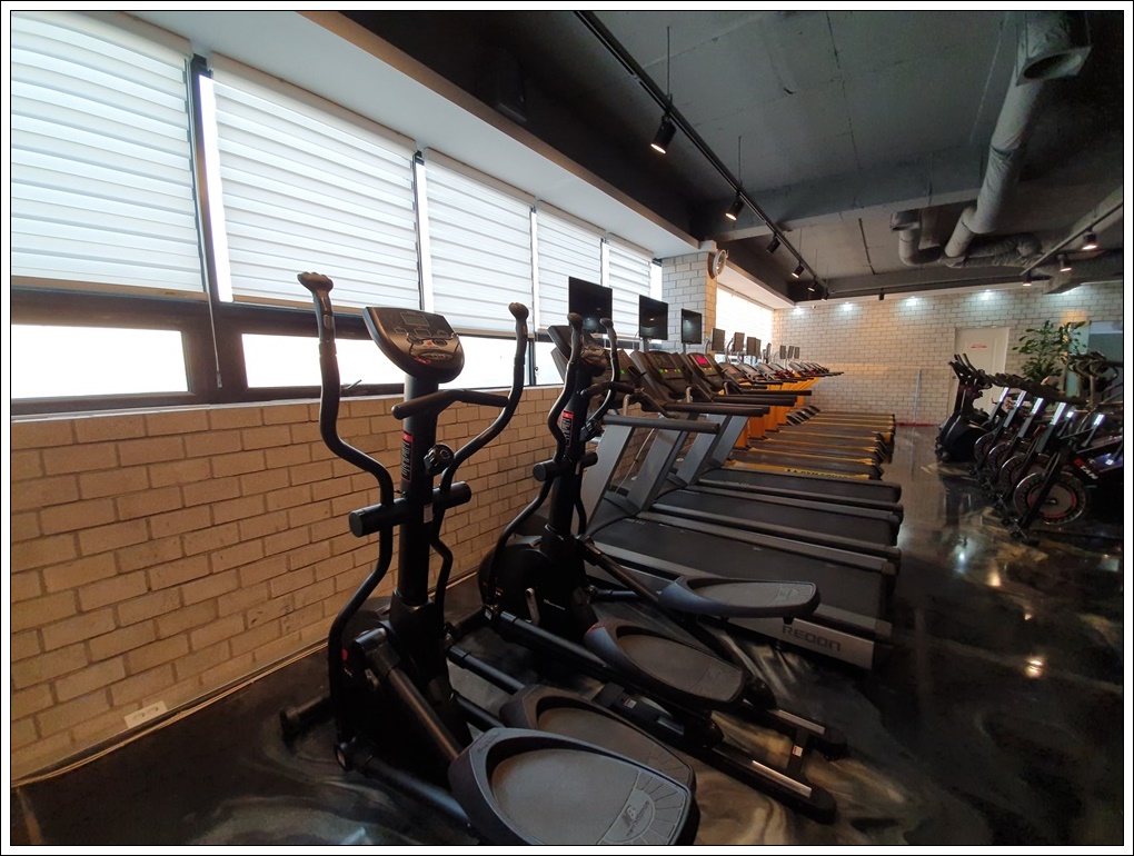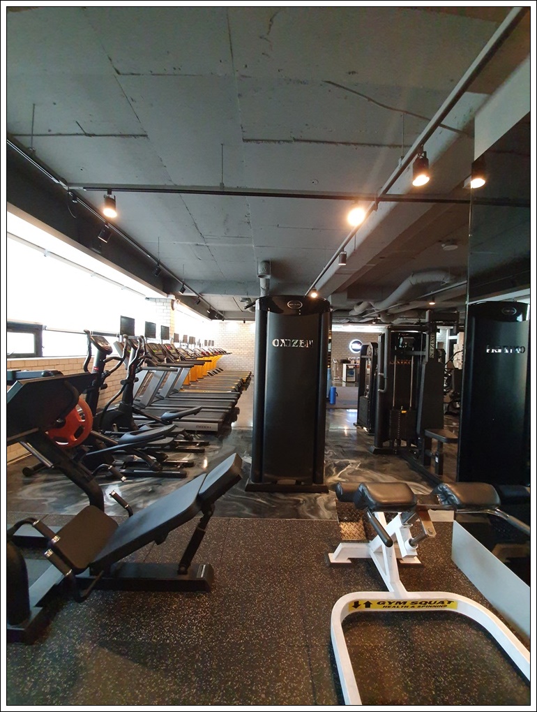 운동 공간은 존별로 구분해 유산소존, 머신존, 프리웨이트존, 스트레칭존으로 구분해 기구를 배치했습니다. 헬스장 기구는 한 번 고정하면 자리를 바꾸는 것이 쉽지 않기 때문에 인테리어를 할 때 신중한 배치를 해야합니다.