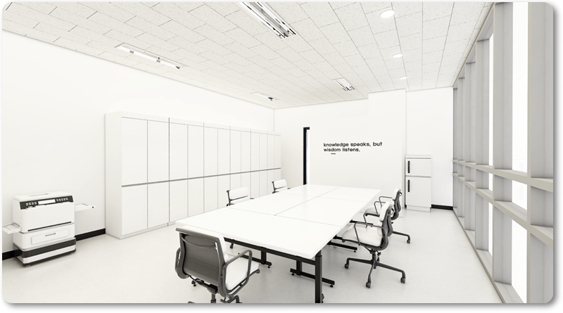 수원 영통 지식산업센터는 화이트 컬러로 잡아 진행하였기 때문에 전체적으로 화사하고 환한 분위기를 보여주고 있습니다. 그로 인해 조명의 경우 기본 조명만 설치해도 공간이 밝아 보이는 모습 확인해 보실 수 있습니다. 또한 한쪽 면이 전체 유리창으로 되어 있어 조도가 밝은 편으로 조명은 기본적인 사무실 조명만 설치하여 드렸습니다.