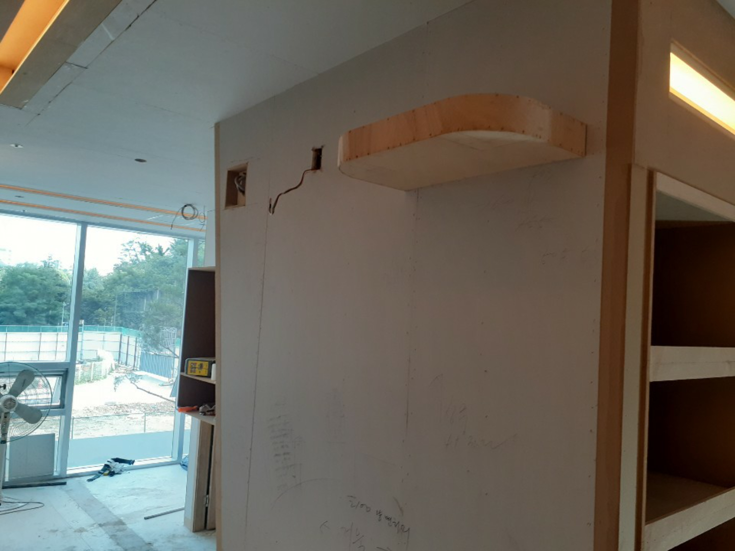 우선 이번 공간에는 컬러 뿐만 아니라 가벽 하나도 평범하지 않은 디자인을 추구하였기 때문에 전체 공간에 대한 이해도가 필요했어요. 그래서 사전에 3D로 현장 이미지를 구현하고 인테리어 시안을 클라이언트분 뿐만 아니라 시공팀과도 공유하여서 먼저 파악을 하고 작업에 들어가게 되었는데요. 이렇게 체계적인 시스템 아래에 인테리어를 진행하면 작업 속도도 빨라질 뿐만 아니라 높은 퀄리티를 기대할 수 있습니다.