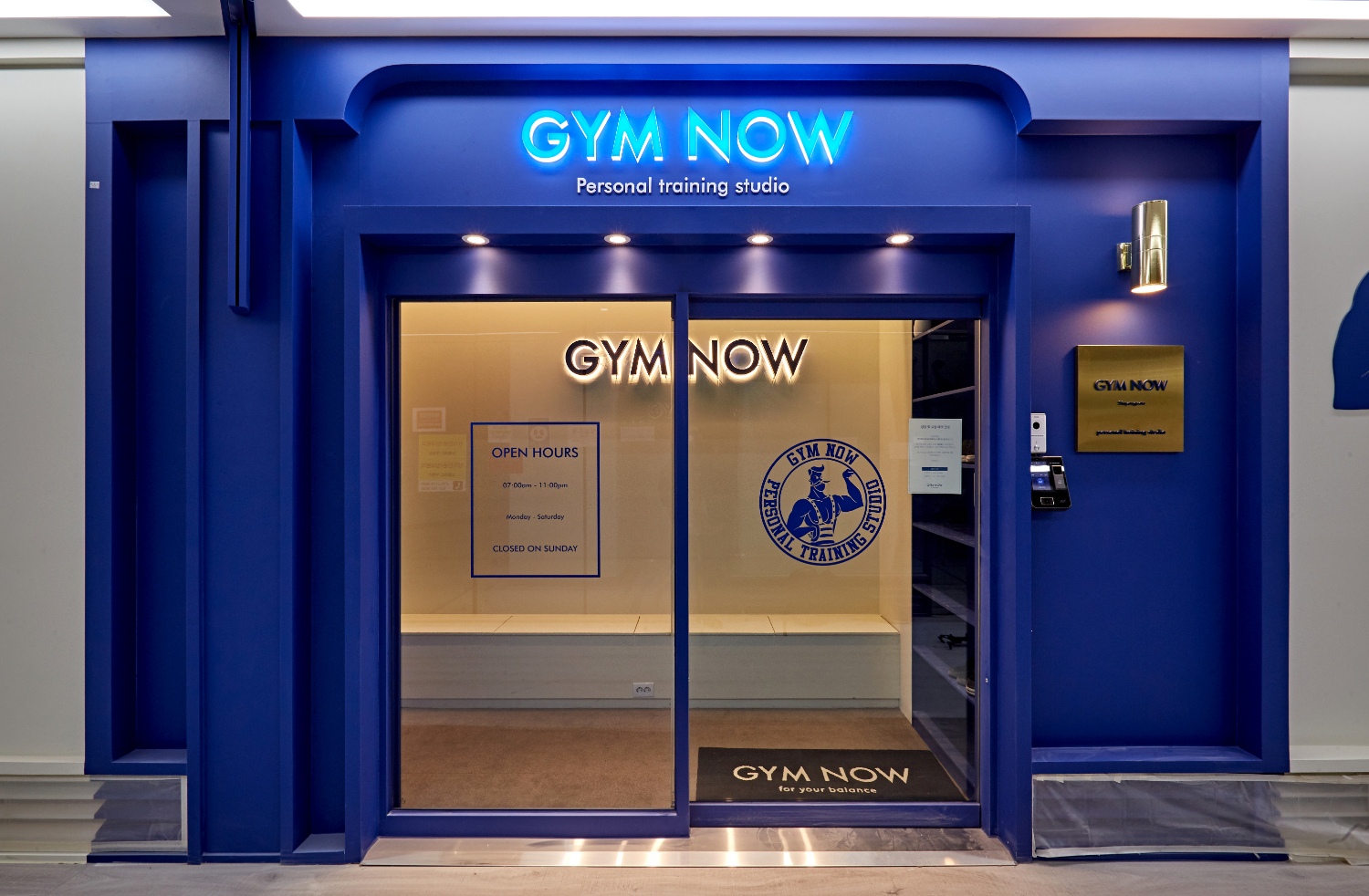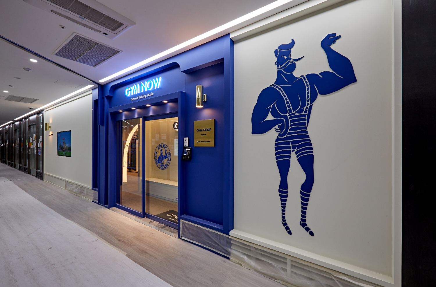 채도가 높고 쨍한 블루 컬러가 한 눈에 들어오실텐데요. 이번 수유 쌍문 건대 피티샵인테리어 현장의 포인트 컬러라고 할 수 있습니다. 전면을 화이트 색상과 블루를 조합하여서 누가 보더라도 그냥 지나칠 수 없게 만들었으며 아치형의 포인트를 넣고 골드컬러의 벽등으로 클래식한 매력도 갖추었는데요. 상단의 GYM NOW 간판은 블루라이트로 제작하여서 더욱 돋보이게 만들었습니다.