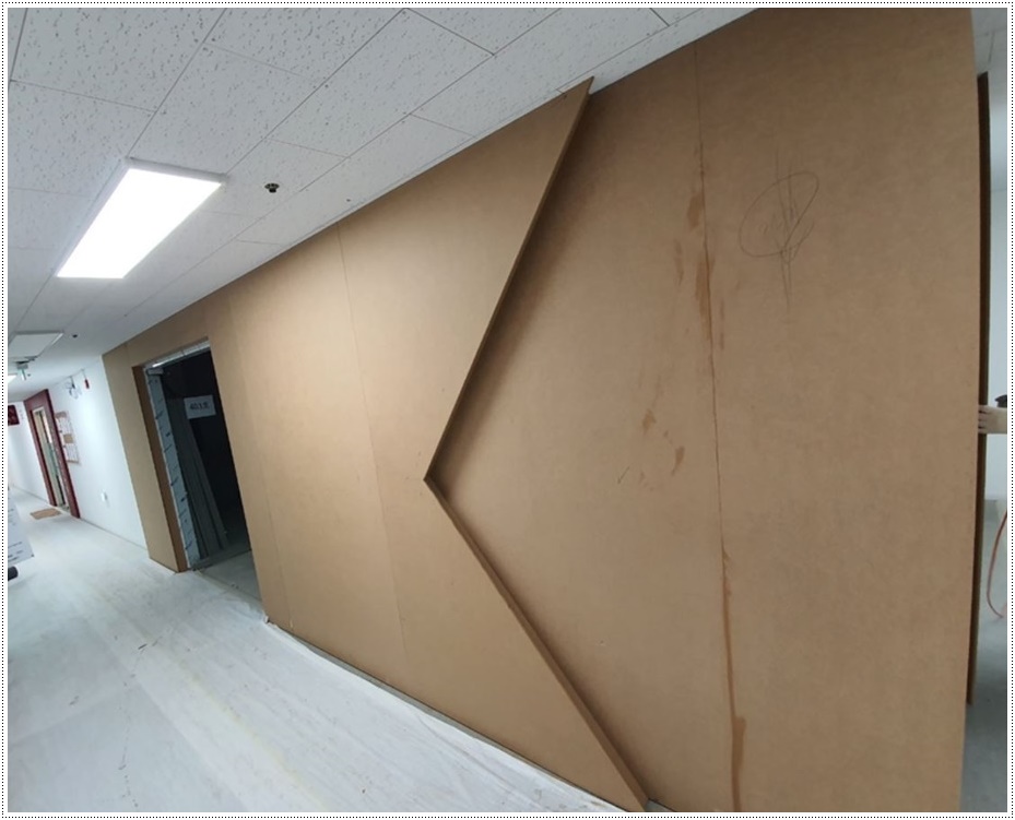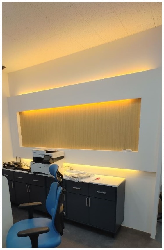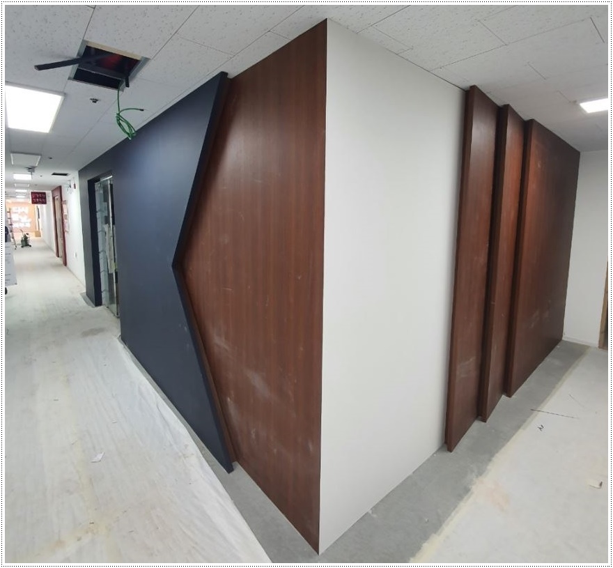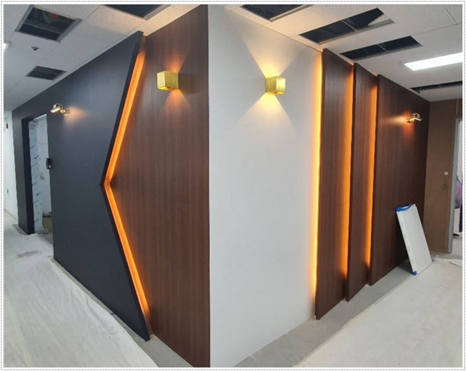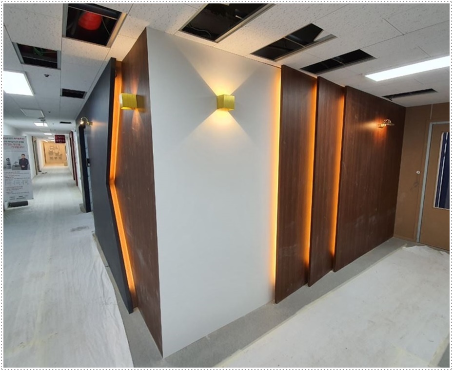 입구 파사드 역시 목공 작업을 통해 틀을 잡은 뒤 조명이 시공될 곳에 배선 공사를 해준 후 필름작업을 진행해 마무리합니다. 필름 작업은 매우 견고하고 세밀한 작업으로 숙련된 전문 인력이 아니면 불량 시공으로 이어지거나 재작업을 해야하는 경우가 생겨 시공에 차질을 빚을 수 있답니다. 저희 916디자인은 모든 공정을 철저하게 지키면서 각 공정에 전문인력을 투입해 진행하고 있으니 믿고 맡겨 주시면 퀄리티 높은 사무실로 완성해드리겠습니다.