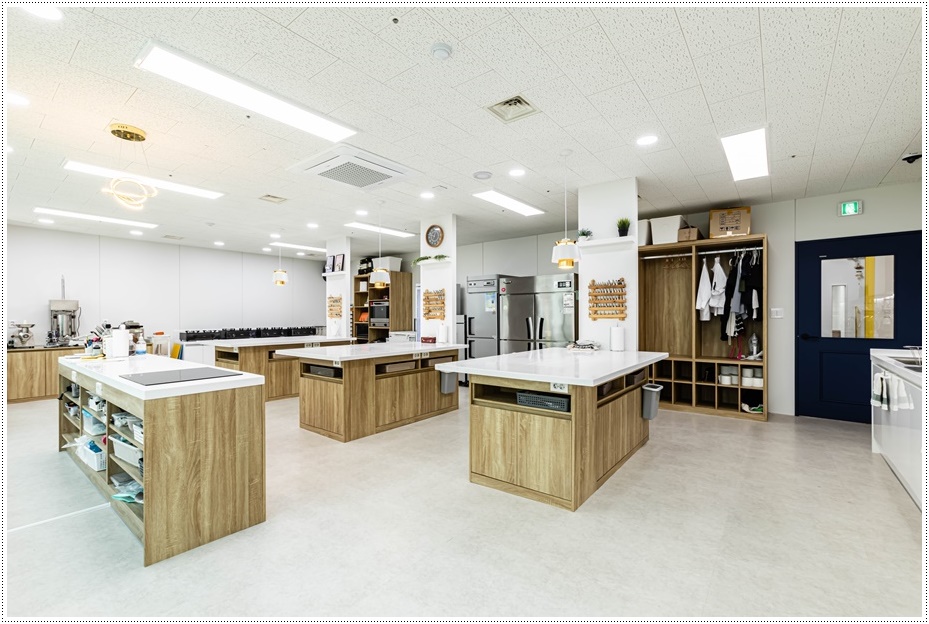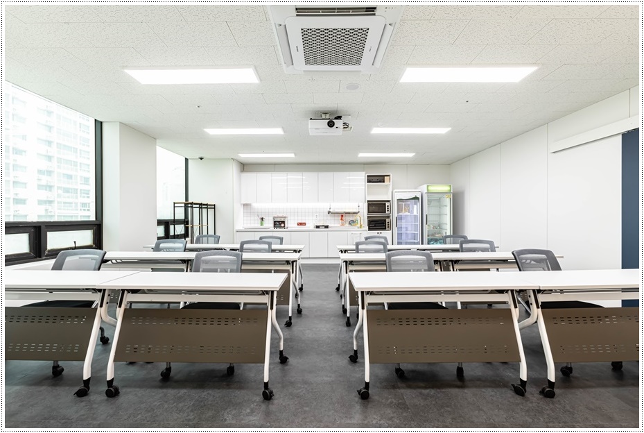 세미나, 강의, 실습 등이 이뤄지는 공간은 충분한 조도를 확보하기 위해 밝은 조명을 시공했고 공간을 활용할 수 있도록 바퀴가 달린 가구를 배치했습니다. 실습 공간은 안전을 위해 테이블간 간격을 충분히 확보했고 벽면에 수납공간을 시공해 사용성과 편의성을 높였습니다.