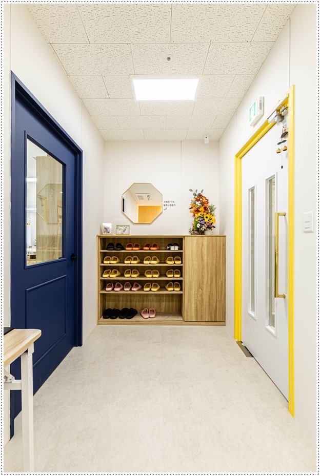 학원 상담이 이뤄지는 사무실은 전체적으로 크림색으로 마감하고 입구에 적용된 옐로우 컬러를 포인트로 사용해 밝고 경쾌한 분위기를 조성해 협회 사무실과는 뚜렷한 차이를 두었습니다. 협회에서 학원으로 또는 학원에서 협회로 이동을 할 때는 내부 연결 통로를 통해 다닐 수 있는데요, 각 공간의 시그니처 컬러인 네이비와 옐로우를 도어에 적용해 영역성을 명확하게 구분했고 신발을 벗고 보관할 수 있는 신발장을 배치해 편리하게 이용할 수 있도록 했습니다.