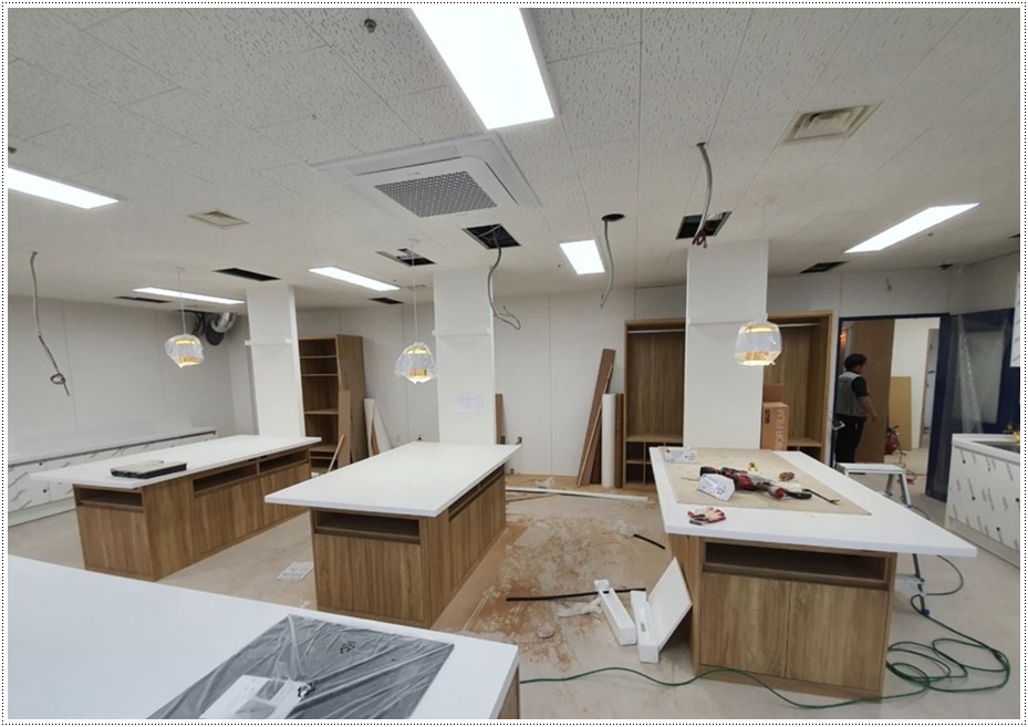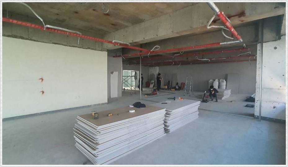 오늘 소개해드릴 현장은 반려동물이 먹는 음식을 만드는 펫푸드 전문학원과 협회가 함께 운영되는 곳이었습니다 그래서 교육장, 세미나실, 조리시설, 사무실 등의 공간을 구성해 공사를 진행했습니다. 우선, 목공 작업으로 가벽을 세워 공간을 나누고 통로, 문 등을 만들고 차음벽을 시공해 옆 공간과의 간섭을 최소화했습니다.
