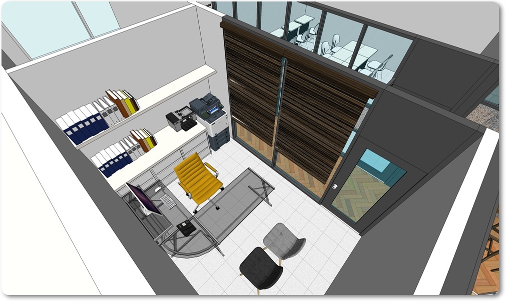 원장실 내부 디자인 모습입니다. 강의영역과 로비영역의 경계인 원장실은 로비에 적용한 중후한 진회색과 강의실에 적용한 연회색을 함께 매치해 원장실의 아이덴티티를 부여했습니다. 유리 가벽에는 블라인드를 적용해 내부 프라이버시를 확보함과 동시에 멋스러운 인테리어가 완성되도록 했습니다.