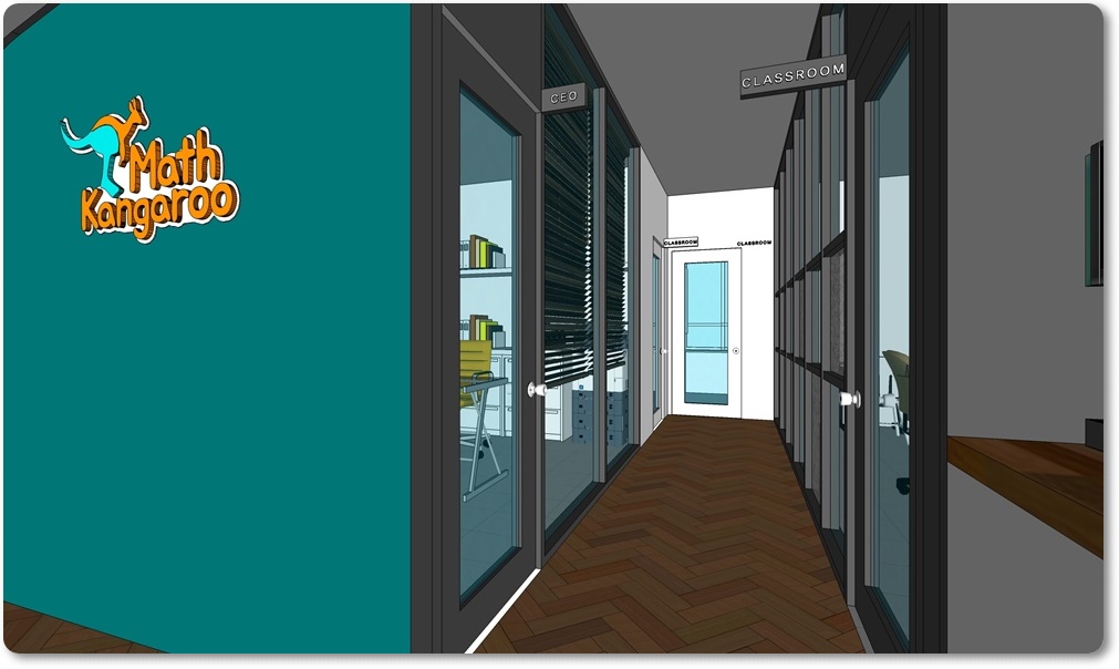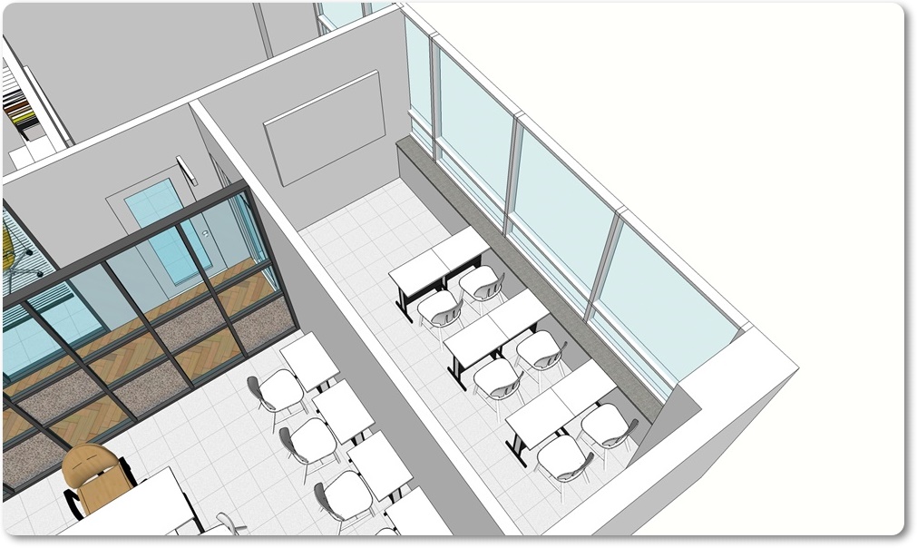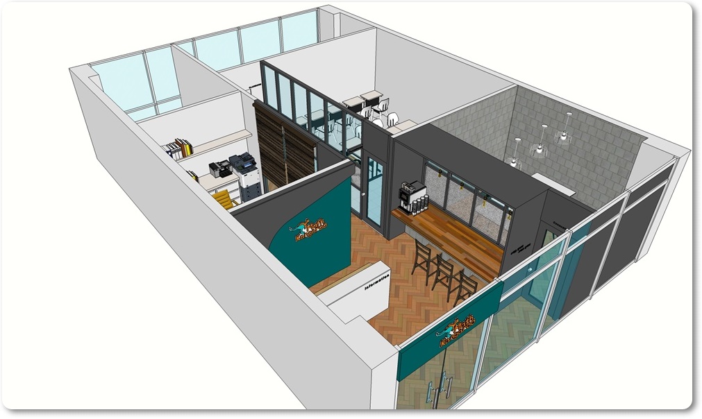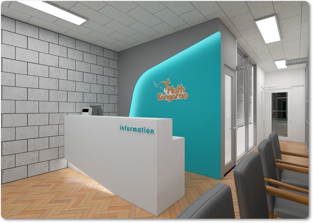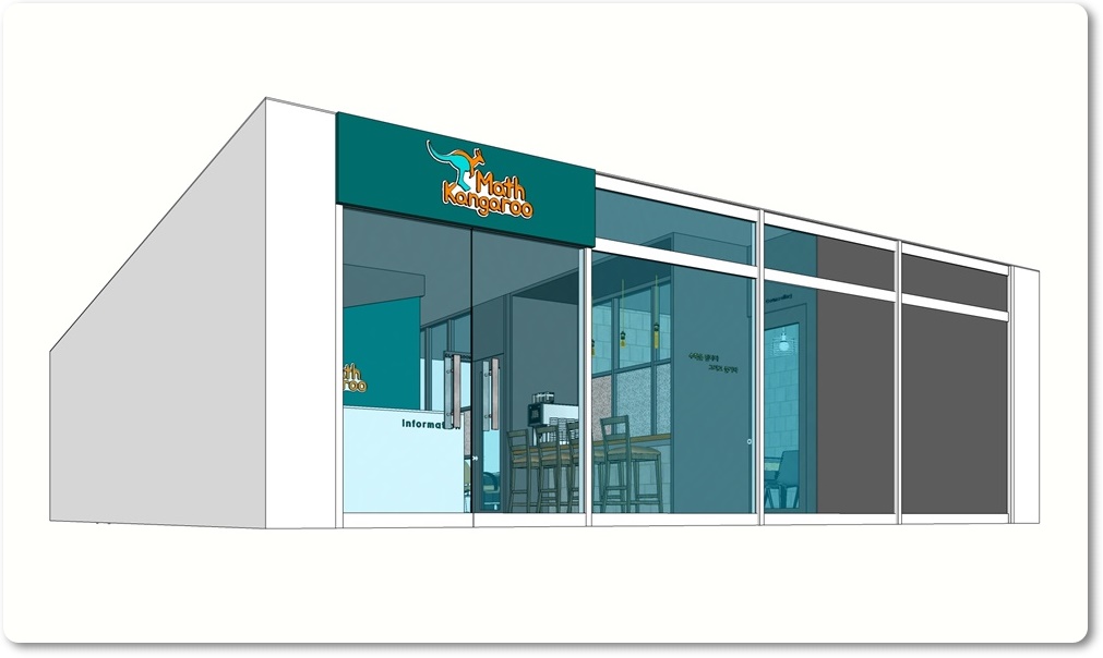 입구 파사드 3D 디자인입니다. 가장 높고 잘 보이는 상단에 간판을 계획해 학원명과 로고를 정확하고 명확히 인지할 수 있도록 했습니다. 전체적으로 글래스 가벽과 도어로 디자인해 외부에서 봤을 때 내부가 디자인의 기능을 하면서 홍보 및 마케팅의 효과가 있도록 했습니다. 아무래도 꽉 막혀있는 곳보다 밖에서도 훤히 보이는 벽은 개방적이면서 자유로운 분위기를 줄 수 있어 호기심을 자극할 수 있답니다.